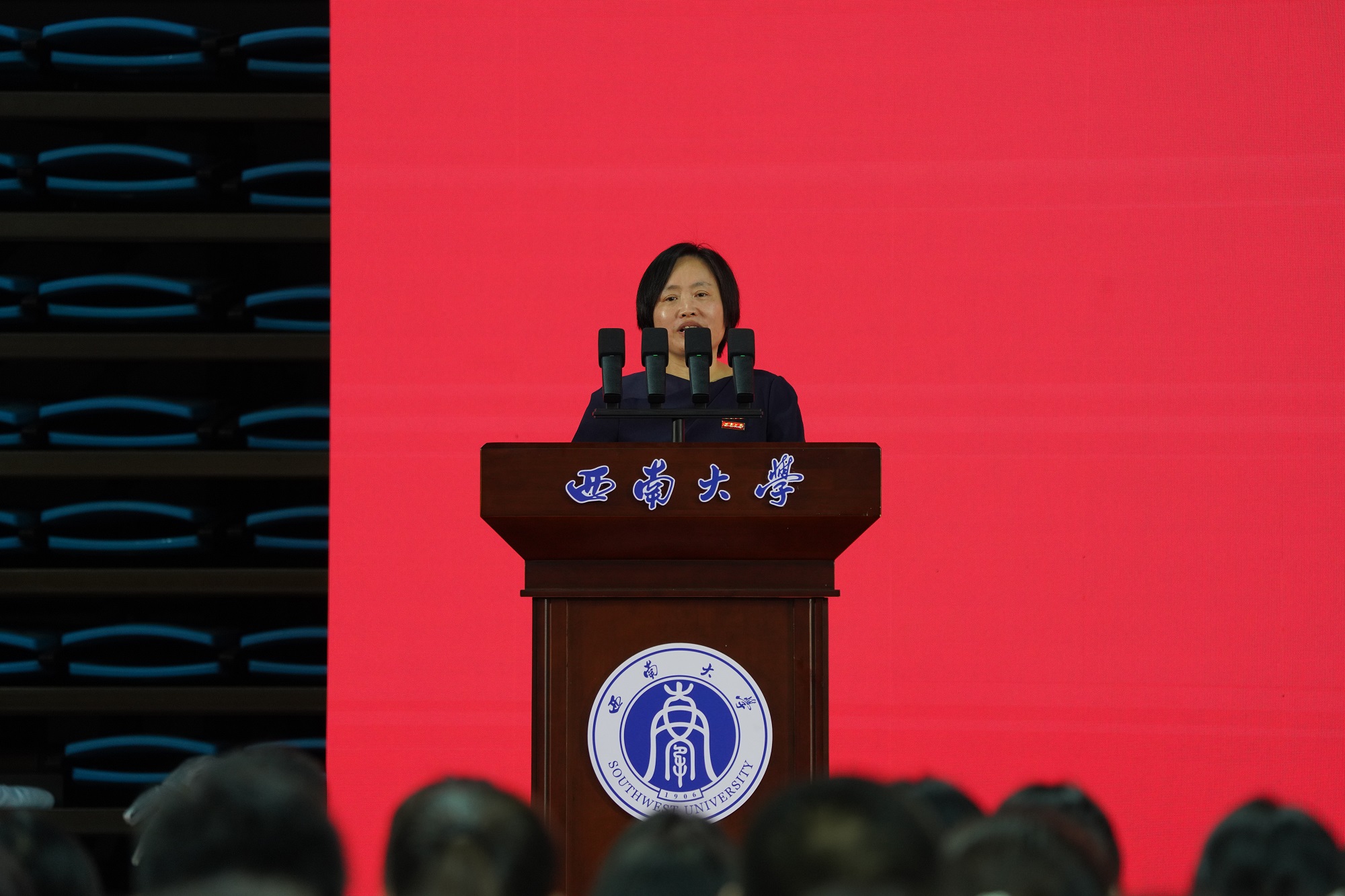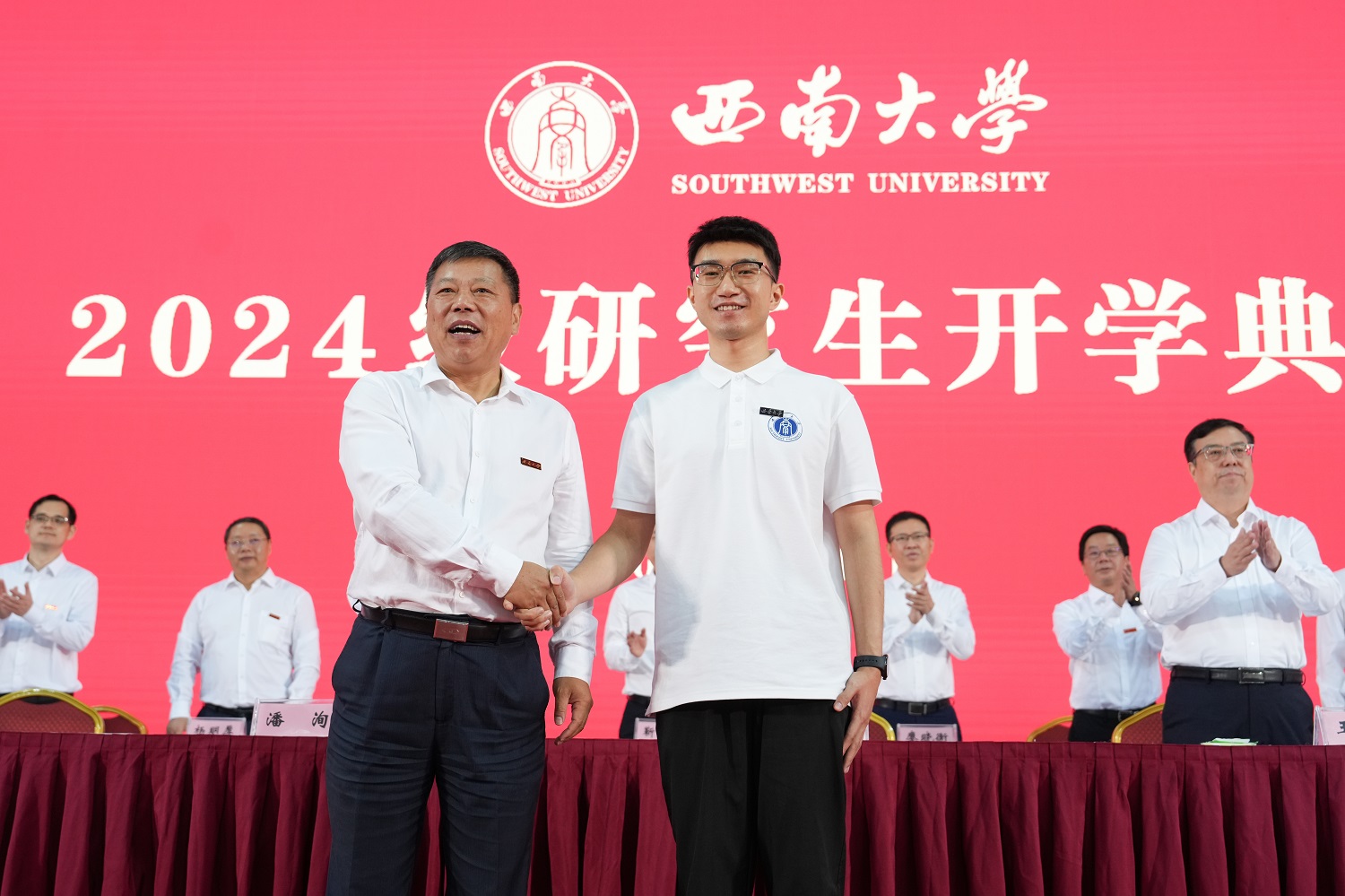 典礼还举行了佩戴校徽仪式。党委书记张卫国为新生代表佩戴beat365英国官网徽章。希望2024级全体研究生秉承“含弘光大、继往开来”的校训和“特立西南、学行天下”的大学精神,薪火相传、不懈奋斗,续写属于新一代beat365人的崭新篇章。