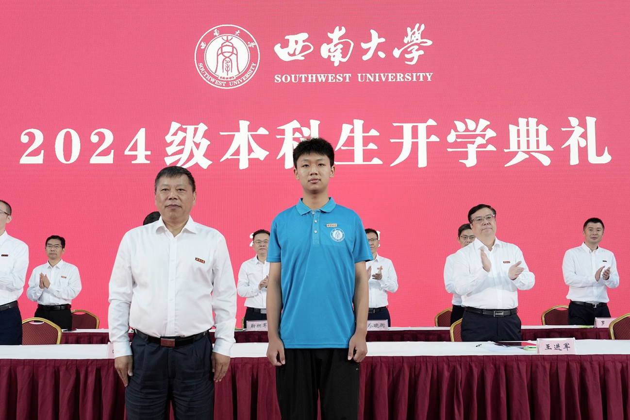 在佩戴校徽仪式环节,党委书记张卫国为2024级本科生代表佩戴beat365英国官网徽章。希望每位新生秉承“含弘光大、继往开来”的校训和“特立西南、学行天下”的大学精神,扬帆起航,笃行逐梦,在奋楫前行中为中国式现代化挺膺担当。