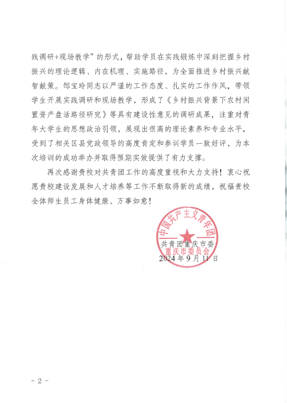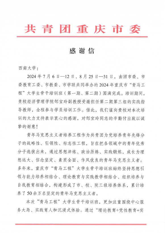 近日,共青团重庆市委向学校发来感谢信,感谢学校对2024年重庆市“青马工程”大学生骨干培训班(第一期、第二期)的高度重视和大力支持。