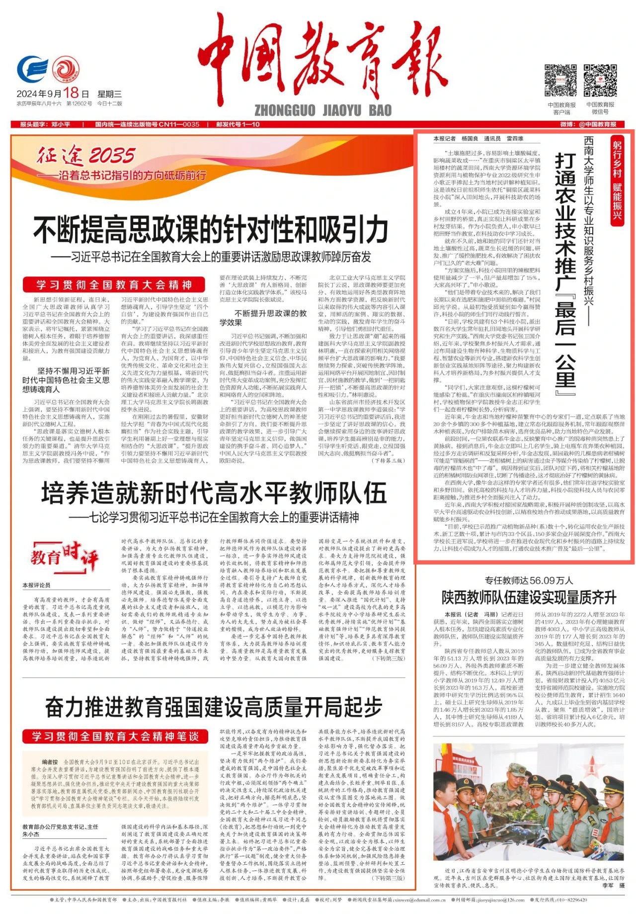 9月18日,《中国教育报》头版以“beat365英国官网师生以专业知识服务乡村振兴 打通农业技术推广‘最后一公里’”为题,通过讲述学校师生扎根乡村一线、深耕科技助农的真实故事,对学校教育赋能乡村振兴经验成效进行了宣传报道,报道全文如下: