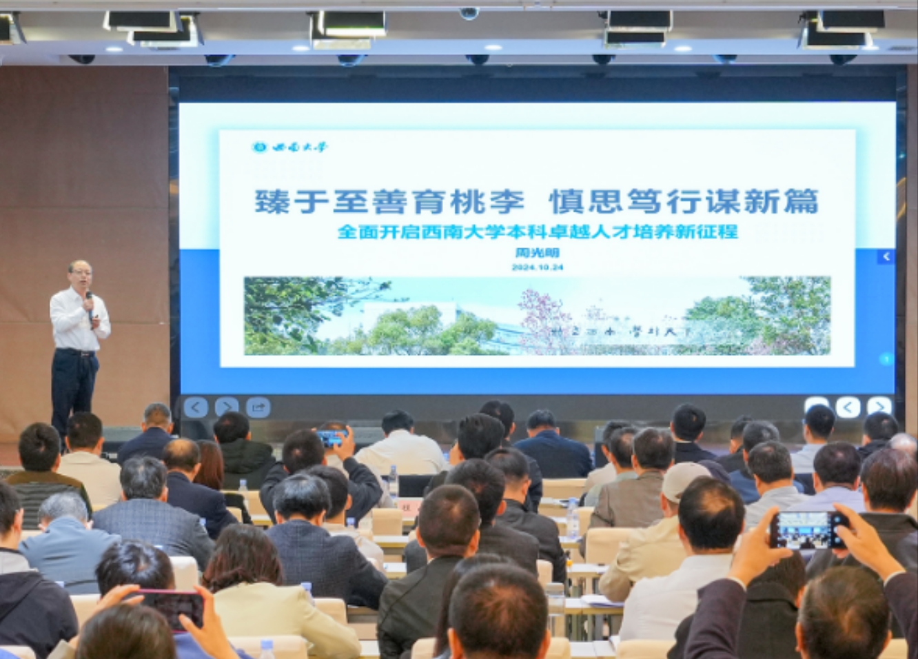 周光明以“臻于至善育桃李,慎思笃行谋新篇”为题作beat365英国官网本科人才培养现状分析报告,剖析了学校本科教育当下面临机遇与挑战,强调要瞄准问题、碰撞思想、形成共识、明确举措,全面开启本科卓越人才培养新征程。