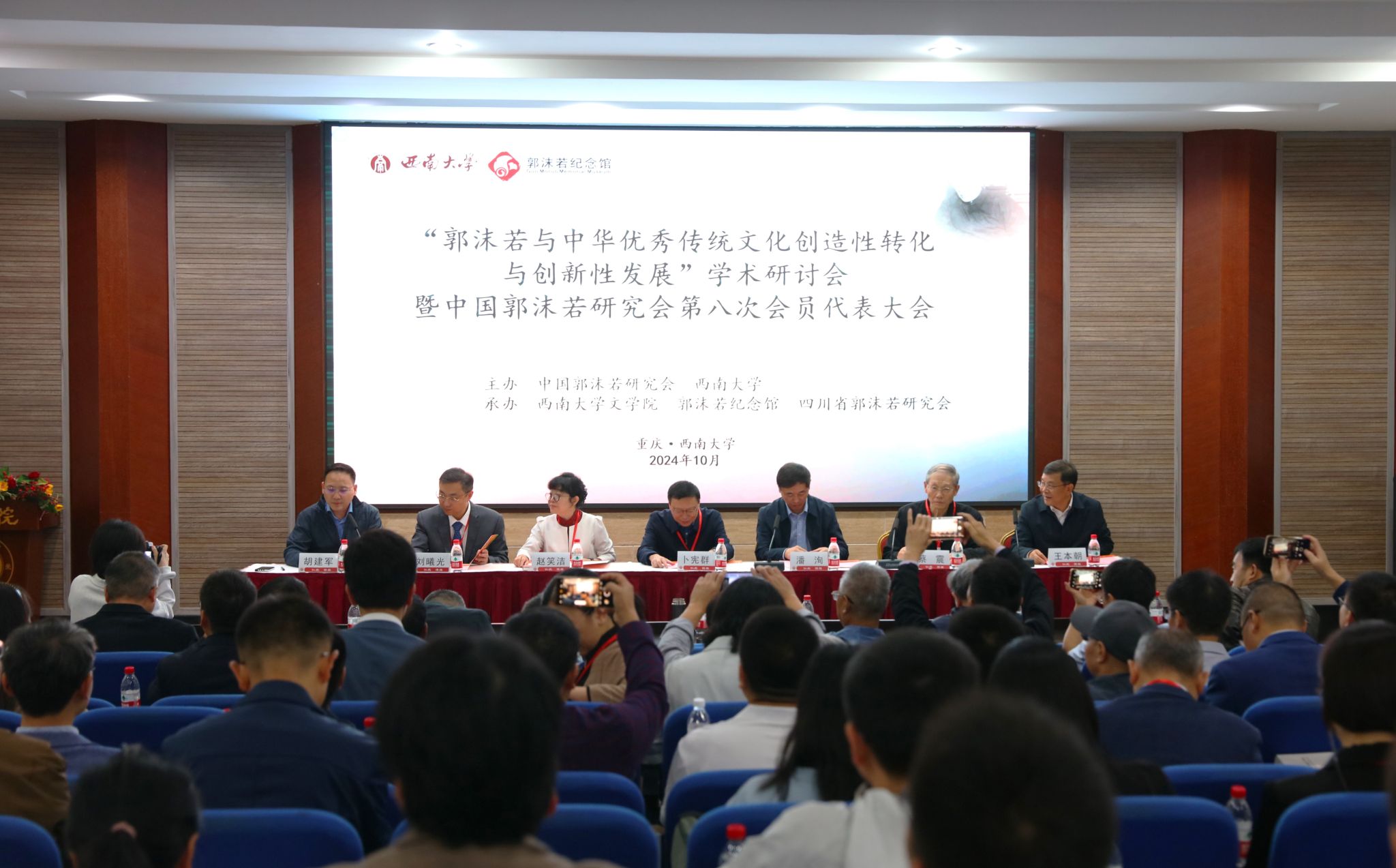 2024年10月19至20日,学校举办“郭沫若与中华优秀传统文化创造性转化与创新性发展”学术研讨会暨中国郭沫若研究会第八次会员代表大会。会议由中国郭沫若研究会、beat365英国官网主办,beat365英国官网文学院、郭沫若纪念馆、四川省郭沫若研究会承办。中国社会科学院古代史研究所所长、学部委员卜宪群研究员,中国社会科学院古代史研究所原党委书记赵笑洁,郭沫若纪念馆原副馆长、中国郭沫若研究会会长蔡震研究员,中国社会科学院郭沫若纪念馆副馆长(主持工作)刘曦光;学校党委副书记潘洵,文学院有关负责人出席开幕会。来自中国社会科学院、中国人民大学、北京师范大学、四川大学、武汉大学等30余所高校及科研院所的70余名专家学者参会。
