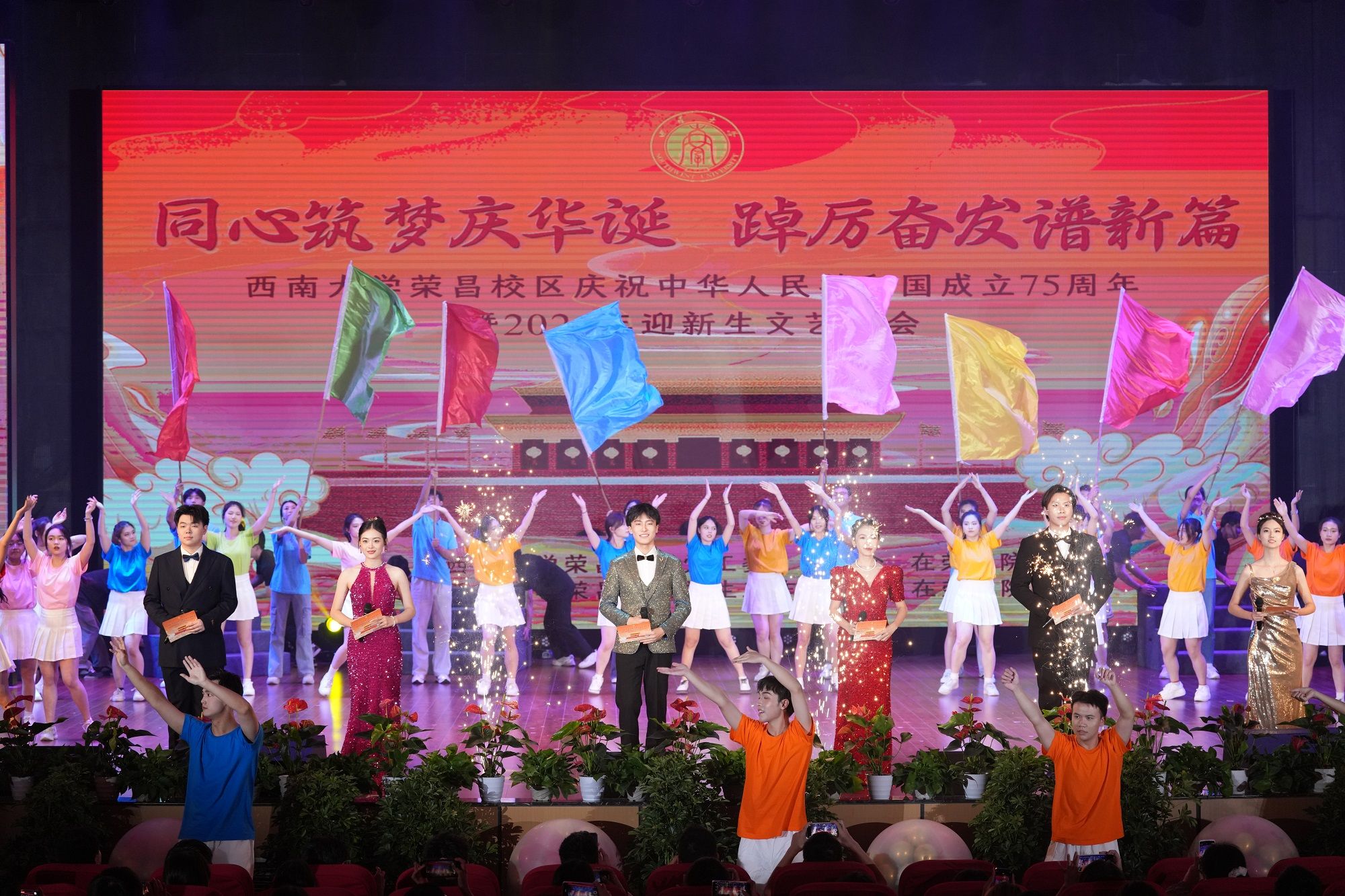 9月27日晚,荣昌校区“同心筑梦庆华诞,踔厉奋发谱新篇”庆祝中华人民共和国成立75周年暨2024年迎新生文艺晚会在荣昌校区学生活动中心举行。校长王进军、副校长葛信勇出席晚会。晚会由荣昌校区党工委、管委会和在荣各学院主办,荣昌校区学生工作办公室与在荣各学院团委承办。