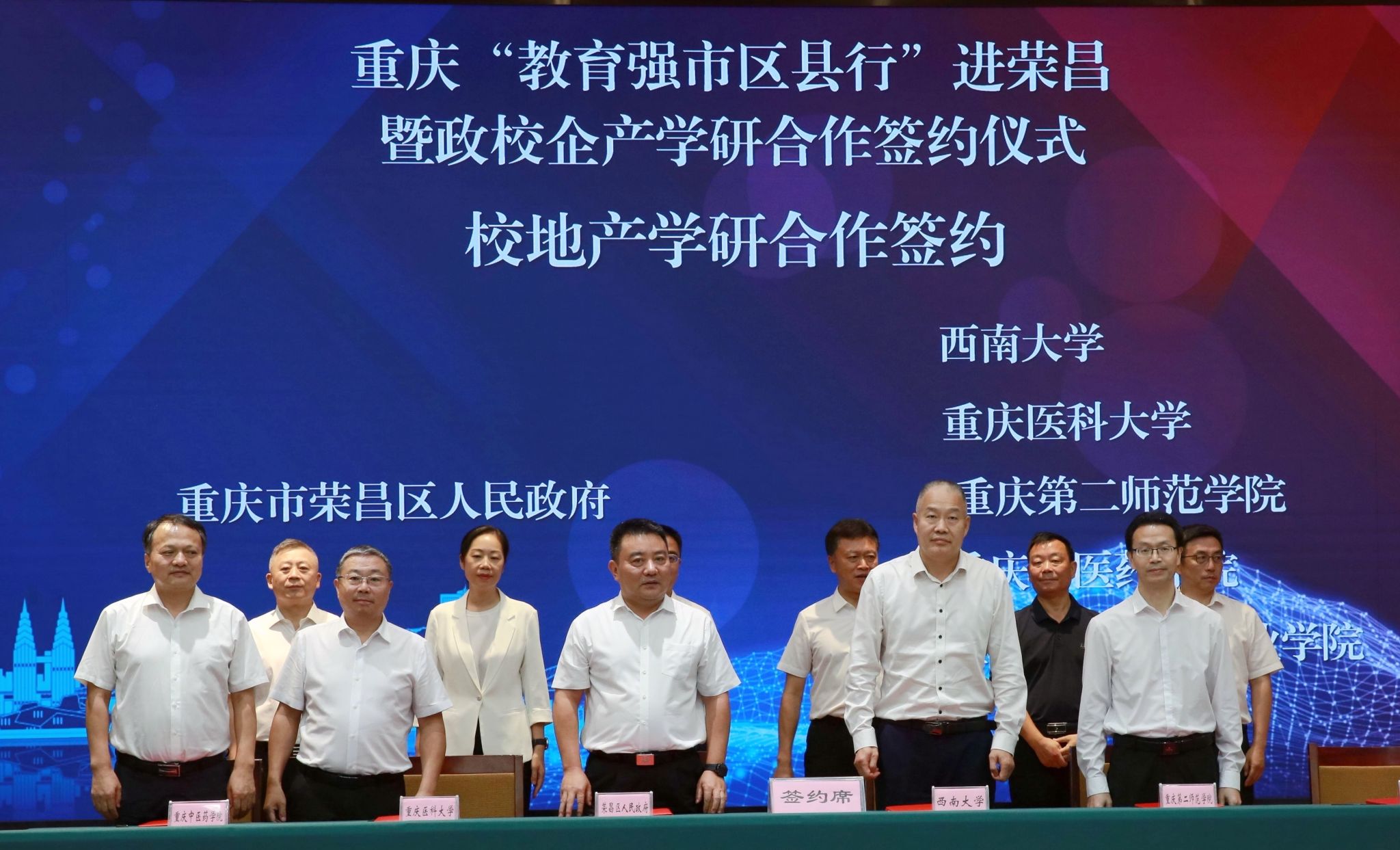 9月26日,重庆“教育强市区县行”进荣昌暨政校企产学研合作对接会在荣昌区举行,党委常委、副校长葛信勇出席对接会并代表学校与荣昌区签署战略合作协议,荣昌校区管委会主任赵永聚一同参会。