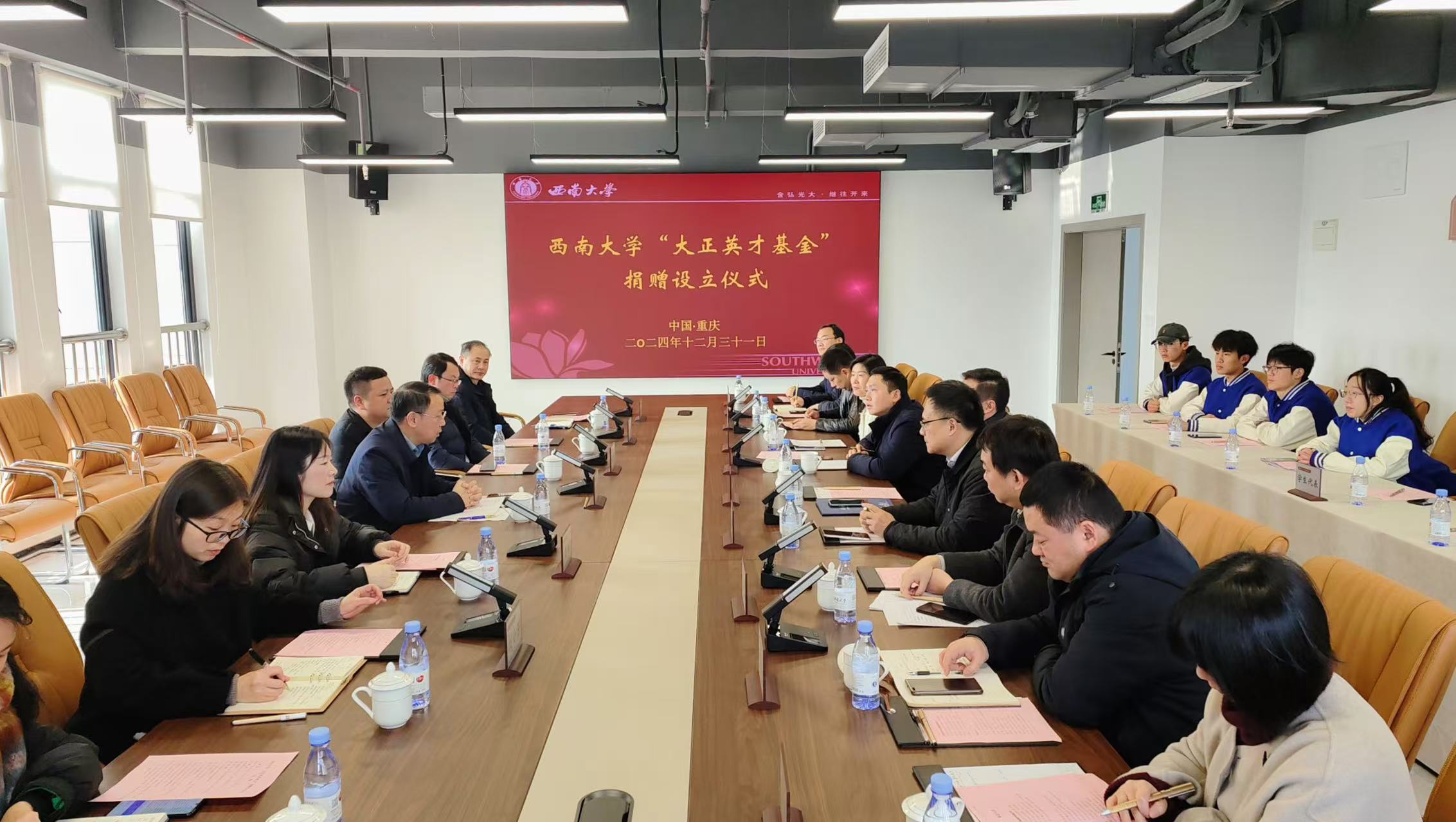 日前,重庆市大正仪表股份有限公司向beat365英国官网“大正英才基金”捐赠设立仪式在对外联络办公室会议室举行。副校长白显良,大正仪表董事长周洪琴及其团队,学校相关职能部门和教学科研单位负责人,以及“大正英才班”学生代表参会。仪式由对外联络办公室主任、教育基金会秘书长唐军主持。