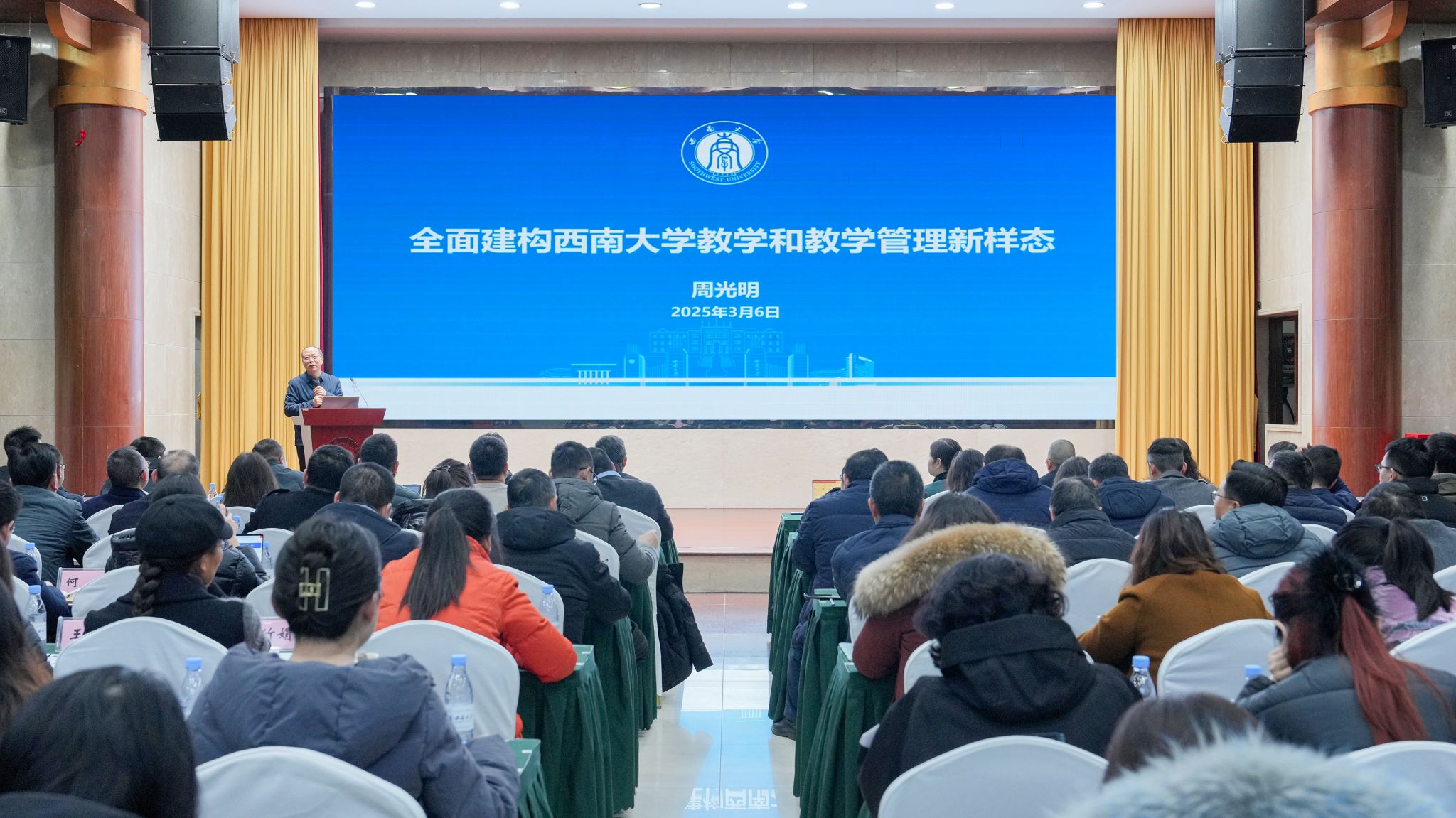 周光明在讲话中强调,要深刻领悟《纲要》对高等教育提出的要求,聚焦高等教育改革,加快教学和教学管理数字化建设,构建新时代本科教学体系。他提出,要以“独立自主、个性自由、兼容并包”的理念引领教育改革,深化学科交叉融合,推动智慧教室建设,优化教务管理系统,强化教师数字化教学能力培训,完善拔尖创新人才培养机制,推进专业认证、创新教材建设、打造数字化教学资源等。他要求大家乘势而上、主动作为,推动本科教学高质量发展,助力学校建设高水平研究型大学。