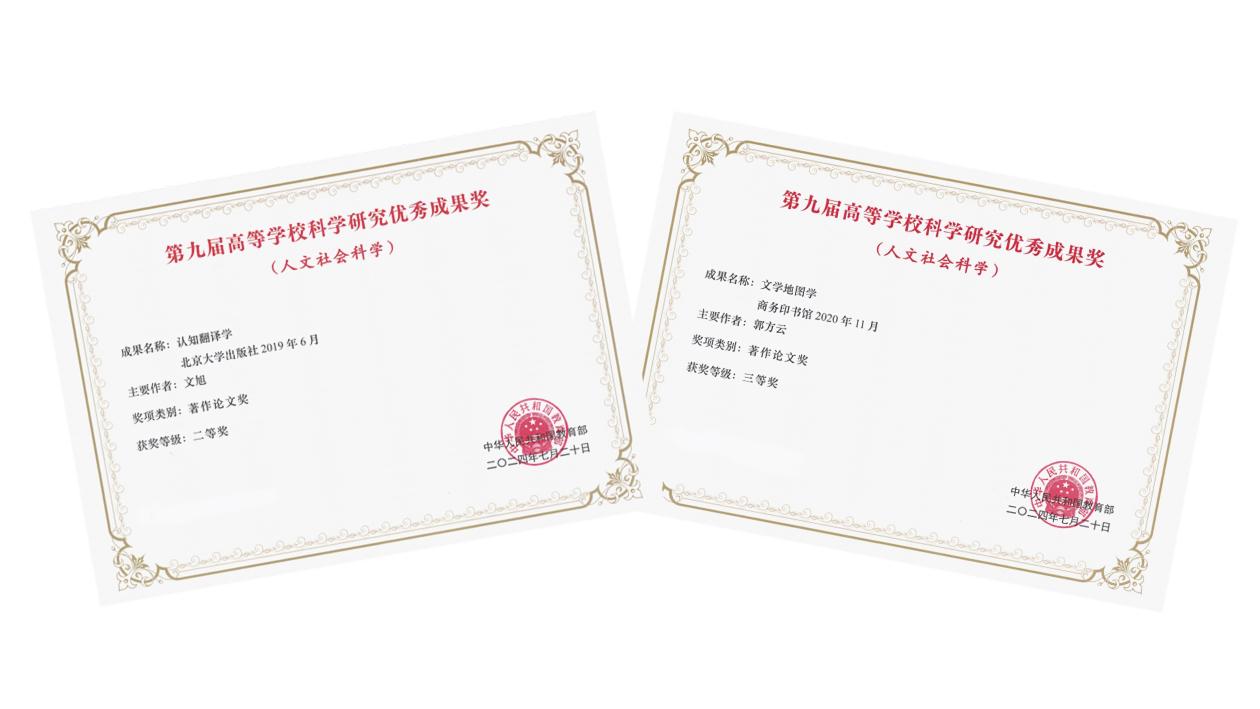 2024年7月,学院文旭教授、郭方云教授研究成果荣获第九届高等学校科学研究优秀成果奖 (人文社会科学)。