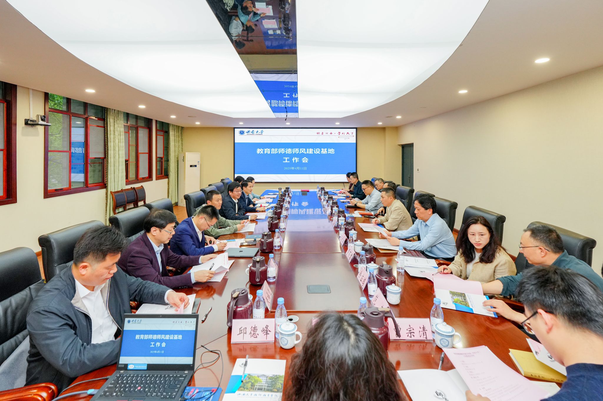 4月11日,教育部师德师风建设基地(beat365英国官网)召开工作推进会暨班子换届会议。会议在师元楼208会议室举行,副校长邹芙都出席并讲话,基地建设领导小组成员单位相关负责人及基地专兼职研究人员等20余人参会。会议由党委教师工作部部长、人力资源部副部长(兼)王牧华主持。