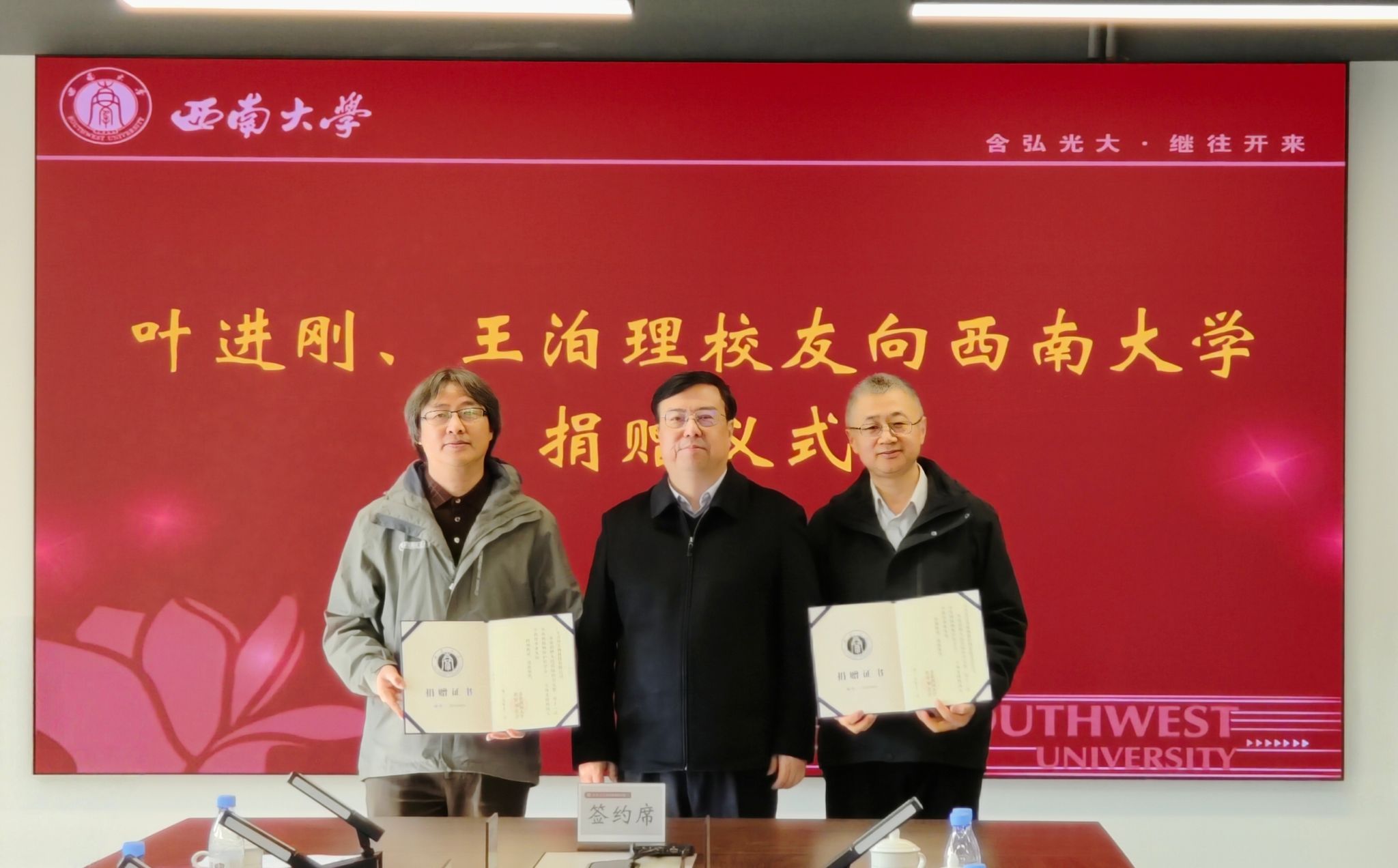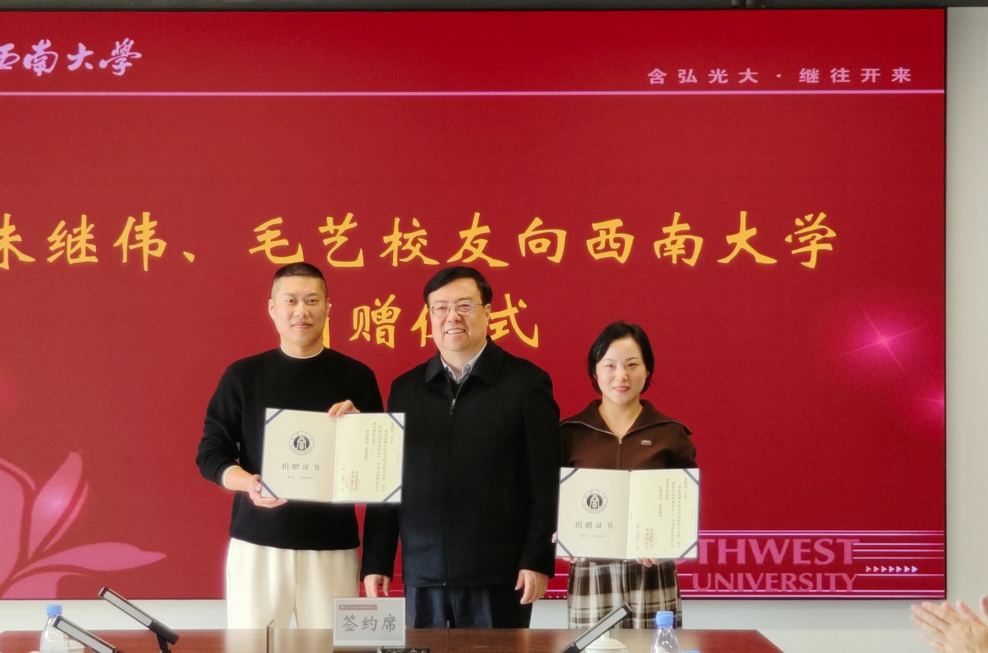 仪式上,植物保护学院1992级校友、天津市汉邦植物保护剂有限责任公司董事长叶进刚,及同届校友、广东真格生物科技有限公司董事长王泊理向学校联合捐赠120万元;四川恒嘉能源集团有限公司总经理、植物保护学院2001级校友朱继伟,美术学院2006级硕士校友毛艺捐赠120万元,以支持学校植物保护学科建设发展与拔尖人才培养,共庆母校120周年华诞。