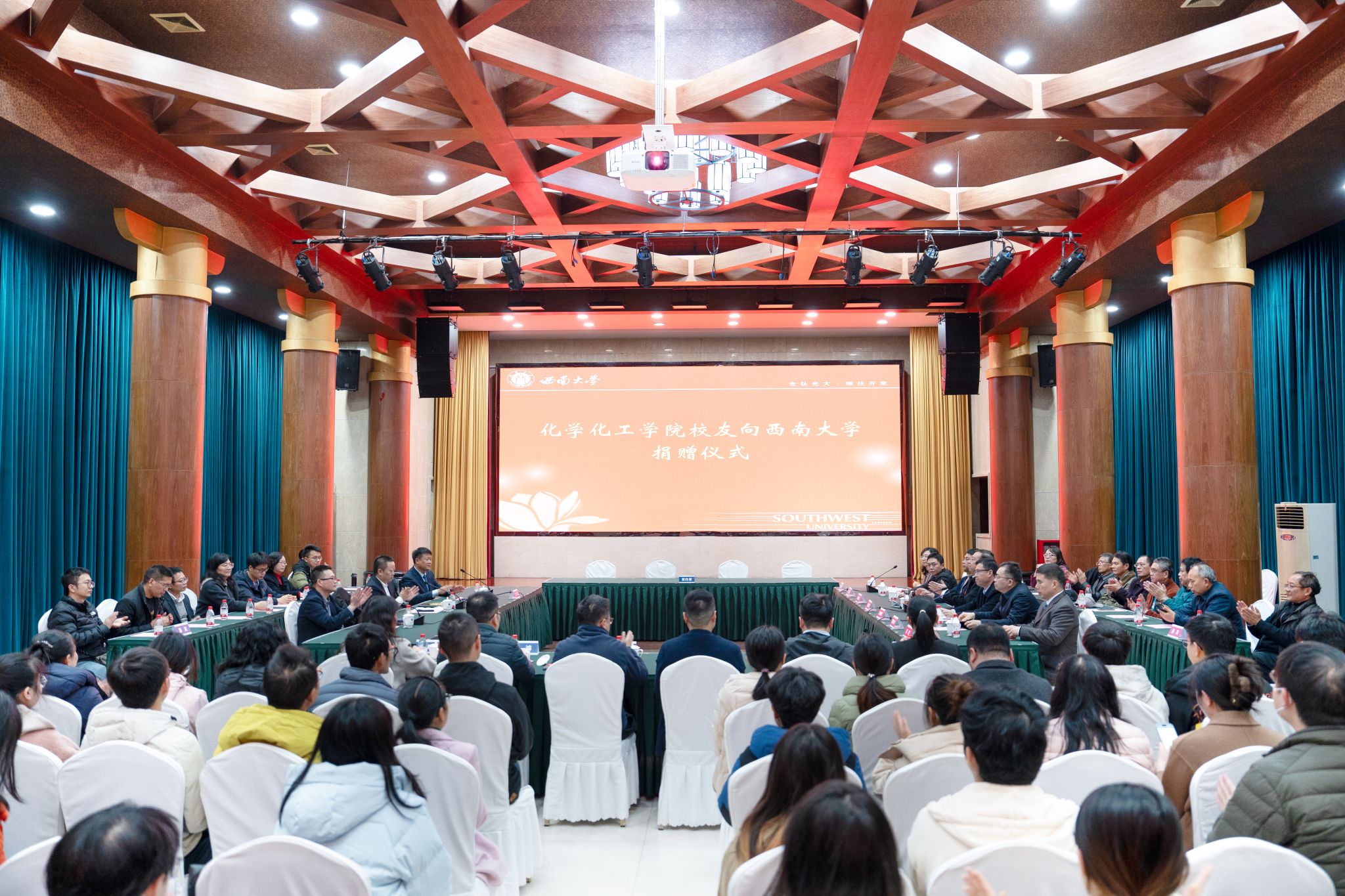 12月5日下午,化学化工学院校友向beat365英国官网捐赠仪式在东方红会议厅举行。聚慧食品科技(重庆)有限公司董事长苟中军、上海美农生物科技股份有限公司质量总监孙磊(代表洪伟校友)、江苏慧聚药业股份有限公司研发副总胡林(代表邹平校友)一行返校捐赠;学校校长、校友总会会长王进军,副校长廖晓衡出席仪式;党政办公室、对外联络办公室、化学化工学院等单位负责人及师生代表参加。仪式由廖晓衡主持。