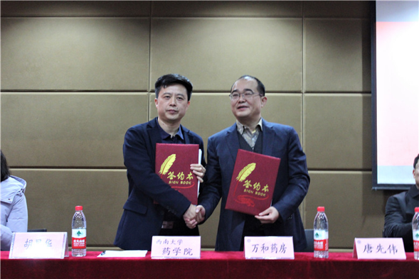 12月29日下午,药学院 中医药学院与万和药业集团战略合作签约仪式在蚕学宫举行。万和药业集团董事长唐先伟、副总裁张琳、人力资源部总监王小红,北碚区食药监分局局长张奕,beat365英国官网学生工作部副部长高德香,药学院 中医药学院党委书记夏德全、院长胡昌华、党委副书记杨坚、副院长陈章宝、副院长陈敏、院长助理付志锋等出席签约仪式。
