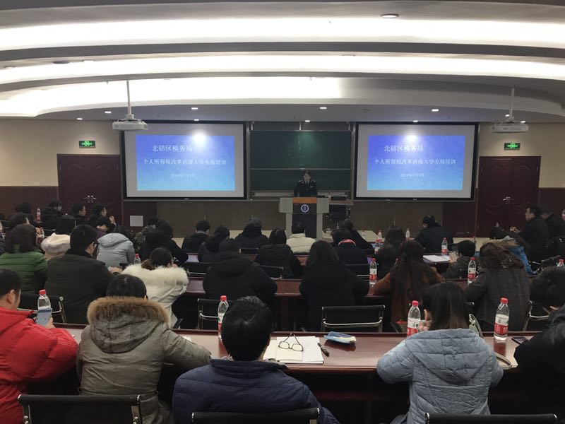 会议由财务处财税管理科科长任元明主持。北碚区税务局所得税科科长唐安明、第三税务所所长徐淳和专管员汤红霞到会进行了指导。学校财务处副处长张红兵在讲话中指出,希望与会人员及时将会议精神传达给所在单位教职工,共同努力做好个人所得税新政策的宣传落实工作。