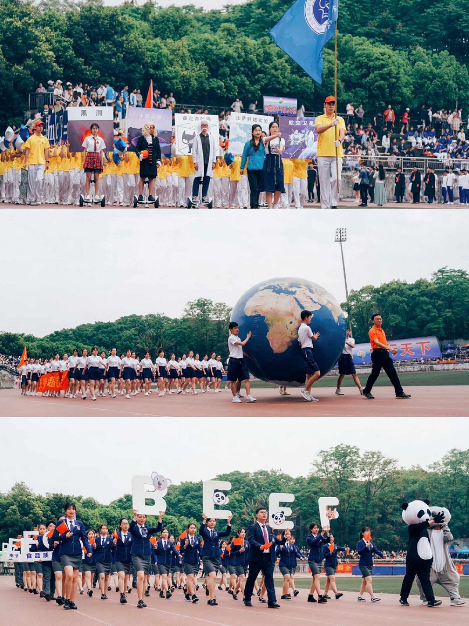 计算机与信息科学学院软件学院的同学用手写板拼凑出键盘的形状。地理科学学院带着巨型手制地球仪步入场内——入场式成了阐释各学院学科专业的“走秀场”,展现了学校莘莘学子特有的朝气,同时也展示了beat365学子的自信与热情。