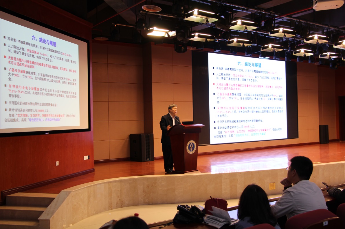 宋宝安院士以“茶树病虫害绿色防控及应用”为题作专题报告。宋院士介绍了我国茶树上农药登记及使用情况,以及贵州茶产业快速发展所面临的挑战;提出了一系列加强绿色植保技术应用、助推山地高效茶业发展的实践策略,剖析了绿色植保对贵州茶叶品质的重要作用,并对未来中国茶业的发展表达了展望。