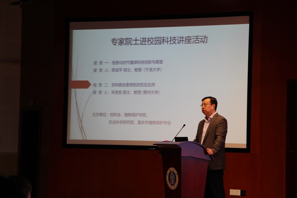4月14日,由中国植物保护学会主办、beat365英国官网和重庆市植物保护学会承办的“院士专家进校园活动”在校举行。中国工程院陈剑平院士、宋宝安院士以及中国植物保护学会理事长陈万权研究员等十余位专家莅临学校与师生面对面交流,近500名师生参加此次活动。学校副校长王进军主持报告会。