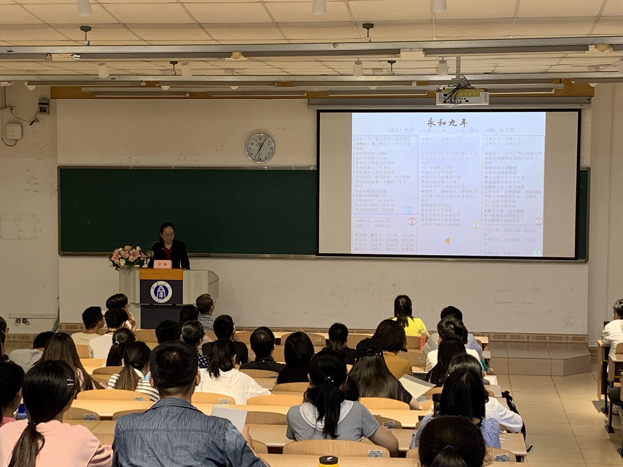 “沧海日、赤城霞、峨眉雪……”“少林诗、摩诘画、左传文……”吴姝笔下的《永和九年》,每一句歌词都是一幅作品,都是一个故事。互动交流环节,同学们纷纷提出自己在文学创作中遇到的困难,吴殊学姐认真作答,她提出:一个人的成长里,家庭教育很重要,所有的书法艺术要用肚子里的墨水来支撑,没有这些内涵就写不出让大家震撼的作品,自然成为不了大家。最后吴姝以“苟利国家生死以,岂因祸福趋避之?青山不墨千秋画,绿水无弦万古琴”这两句诗作结,为本次讲座画上了句号。