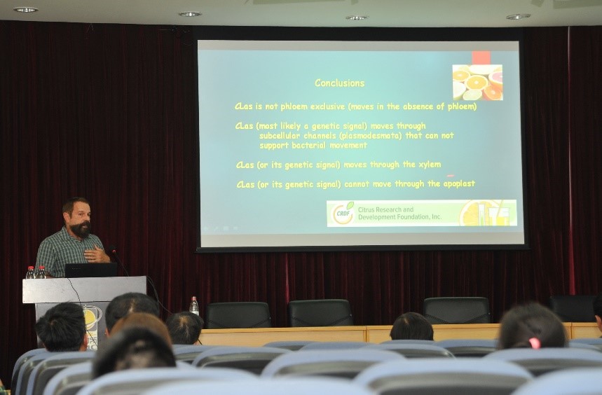 5月7日,应“柑桔主要病虫害持续控制基础研究学科创新引智基地”(111计划)和柑桔研究所邀请,美国佛罗里达大学柑橘研究与教育中心Edgardo Juan Etxeberria教授来所访问,做了题为“HLB,More Questions Than Answer”的学术报告,报告会由柑橘研究所郑永强教授主持。