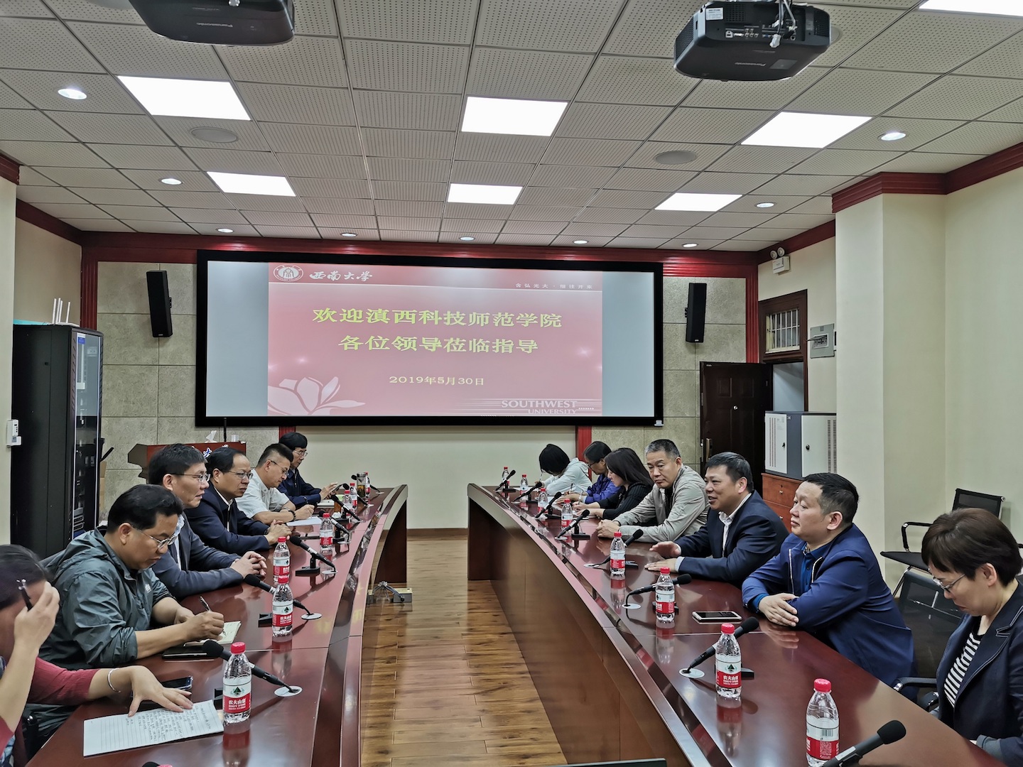 会前,张卫国校长与王德强校长一行进行了座谈交流。张校长指出,支援滇西科技师范学院对当地经济社会建设具有重要意义,两校在教师教育、农学等专业有很多共性,具有良好的对口支援基础。他强调,学校将充分利用优质资源和办学经验,全力支持滇西科技师范学院办好本科教育,帮助提升人才培养质量。
