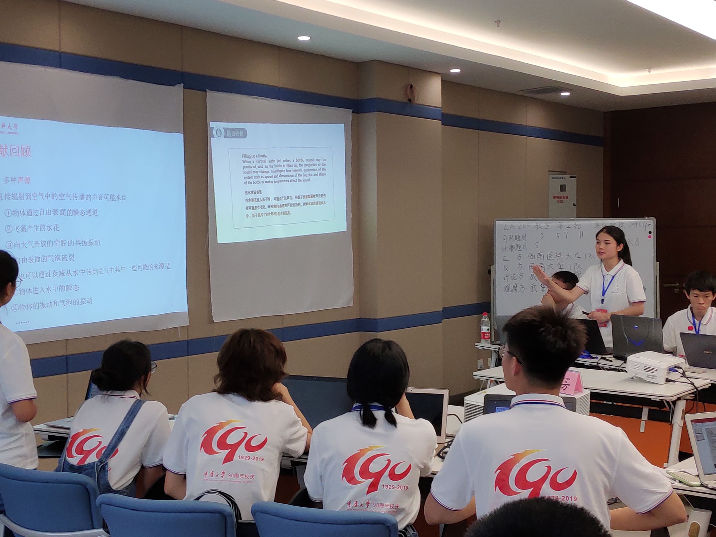 在为期两天的比赛中,两支代表队表现突出,就牛顿摆的衰减率如何受到牛顿摆球数量、材料、排列的影响;冰糕棍如何在崩溃中产生眼镜蛇波;200μm左右的酱油波层有怎样的光学性质;气溶胶的产生受到哪些因素的影响;摩尔纹在织物密度的测量上有什么样的创新设计等课题,与各高校代表队进行了深入的学术探讨。