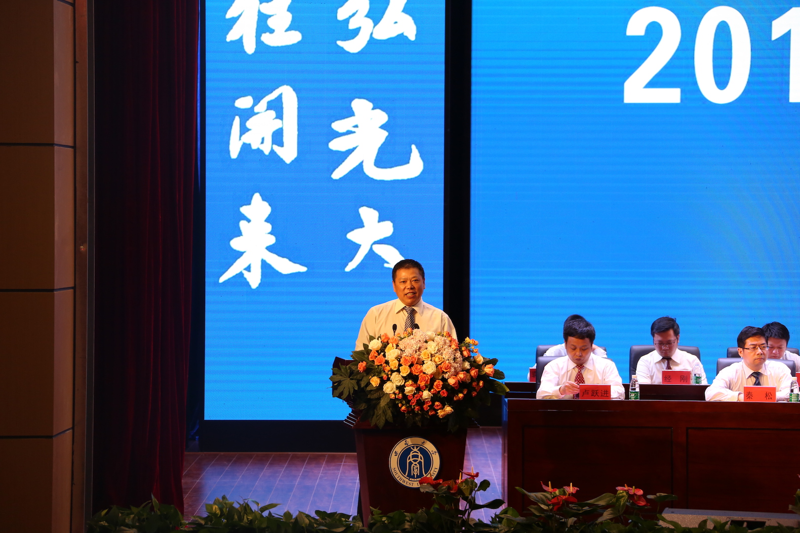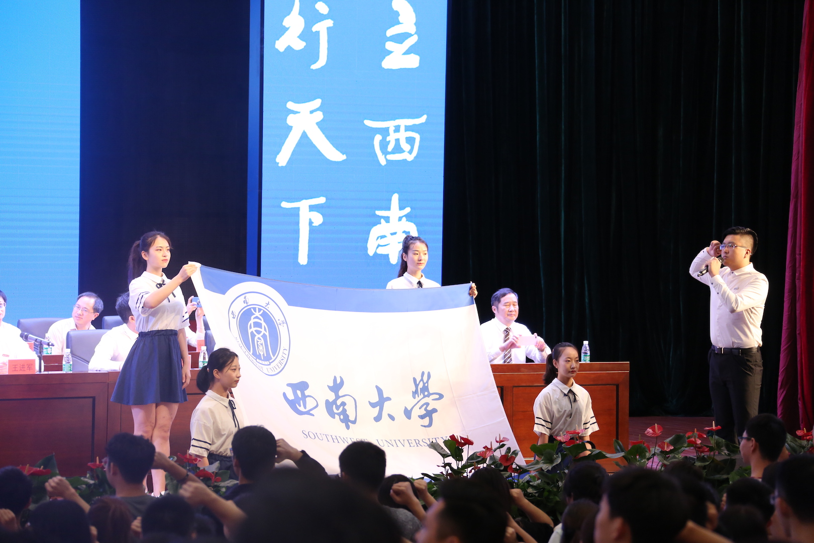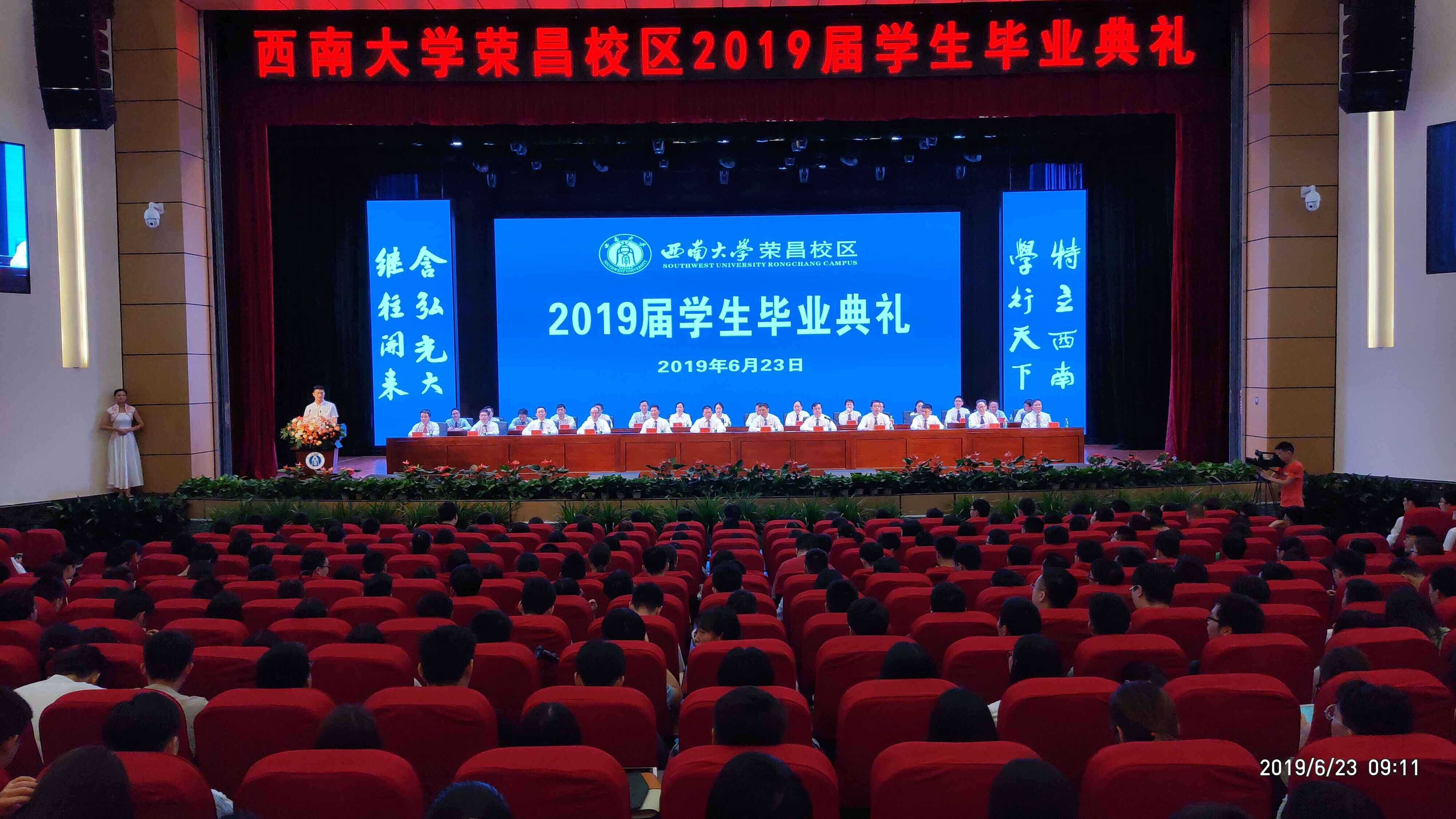 樟林绿荫伴君行,玉兰凝香为卿芳,6月23日上午,学校荣昌校区2019届学生毕业典礼在新建成的学生活动中心举行。校长张卫国,党委副书记潘洵,副校长靳玉乐、王进军,学校党委办公室、校长办公室、教务处、研究生院、学生工作处、招生就业处相关负责人,校区党工委、管委会负责人,学院(部)党委书记、院长、副书记、副院长,校区各职能部门负责人,校友代表,教师代表、全体辅导员、班主任代表、家长代表及2019届全体毕业生等参加了毕业典礼。典礼由王进军副校长主持。