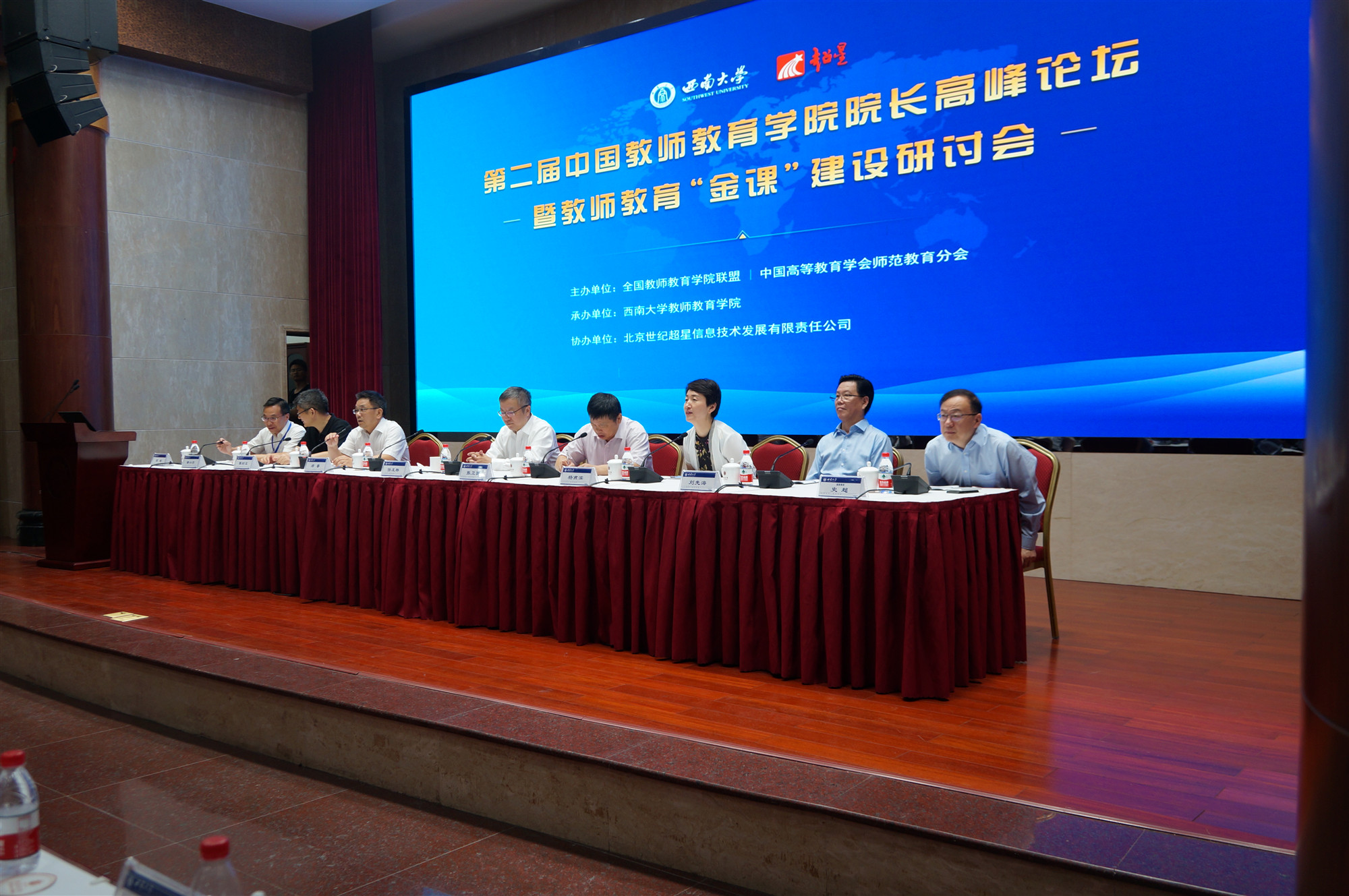 7月6日,由全国教师教育学院联盟与全国高等教育学会师范教育分会联合主办,beat365英国官网承办,北京世纪超星信息技术发展有限责任公司协办的中国第二届教师教育学院院长高峰论坛暨教师教育“金课”建设研讨会在东方红会议厅召开。本次论坛的主题是:新中国成立七十年教师教育经验与未来展望,教师教育学科发展与师资队伍建设,教师教育“金课”建设及课程共享机制,新时代教师教育人才培养模式改革。来自全国30多所高校的100多位教师教育学院院长及专家齐聚一堂,共同商讨教师教育工作发展前景。教育部教师工作司司长任友群、副司长杨燕滨、教师管理处处长黄小华、重庆市教育委员会副主任邓睿、副巡视员刘先海、beat365英国官网校长张卫国、副校长陈时见、北京超星集团董事长史超出席会议。