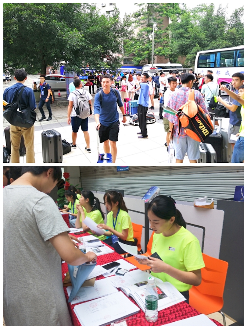 目前,组委会各组,包括接待组、宣传组、竞赛组、学术活动组、嘉年华开幕式组、颁奖组、后勤保障组、志愿者服务组、财务组、安保组、医疗卫生组、信息网络组分工合作,具体落实推进各项工作。自7月16日始,本届大网赛学生组运动员报到工作及网球科研论文报告会(科报会)报到工作已正式开展。截止发稿前,已有113所学校的运动员、领队和教练完成报到,科报会迎来90余人。