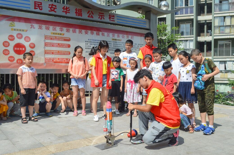 这是来自物理科学与技术学院实践团给当地孩子带来的趣味课堂,他们结合自己的专业所学,在课堂上带领孩子们做起了水火箭,刚刚的一幕便是在展示实验成果。今年暑假,物理科学与技术学院教育关爱服务团与重庆九龙坡团区委携手推进“暑期嘉年华”项目,组建“专业教师+学工队伍+学生骨干”的人员队伍,赴华岩镇民安华福公租房社区开展了“青春奋进庆华诞,科普惠民进社区”师生主题社会实践活动。