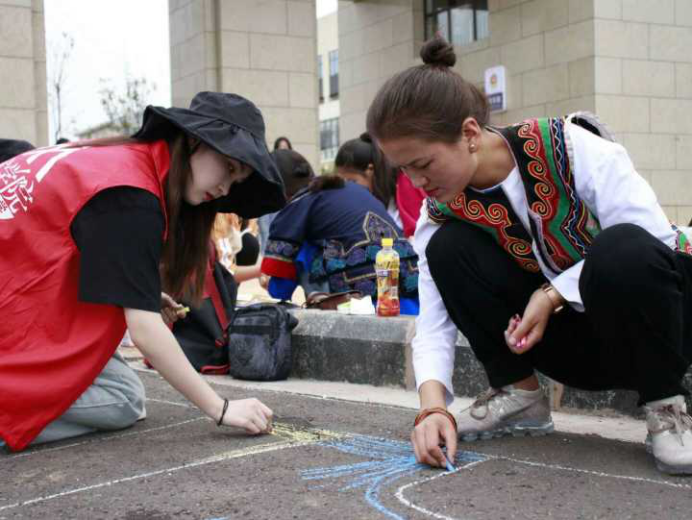 这是美术学院文化艺术服务团15名师生和200名幼师美术专业、学前教育专业、小学教育专业学生共同绘制的杰作。学校美术学院退休教师、曾自驾走完红军长征路的著名红色写生艺术家刘增宪教授带领该校美术专业13名大学生,组成“艺术关爱凉山行”暑期“三下乡”文化艺术服务团,来到beat365英国官网对口帮扶的西昌幼儿高等师范专科学校,开展“大手牵小手”儿童美术教育等实践活动。13名大学生分散到西昌民族幼专四个班级,开展为期3天的水彩技法、速写、现代舞和现代摄影艺术基础四门课程教学,以轮班教学形式,让该校4个班级近200名学生比较迅速地掌握四种艺术基本常识和技巧。