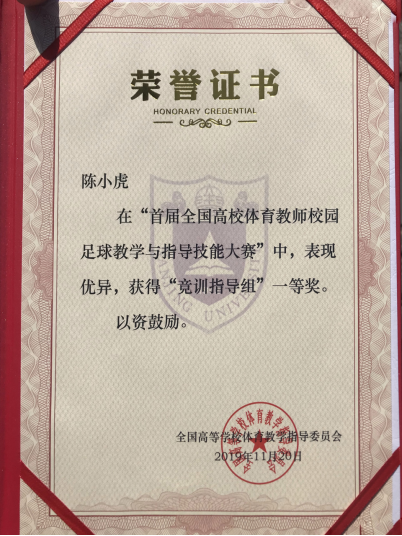 11月18日至20日,首届全国高校体育教师校园足球教学与指导技能大赛在南京大学举办,学校体育学院教师陈小虎表现优异,获得“竞训指导组”一等奖。该比赛由全国高等学校体育教学指导委员会主办、南京大学承办,近200所来自全国各地的高校体育教师参与激烈角逐。