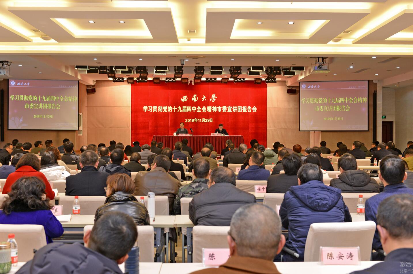 为学习宣传贯彻党的十九届四中全会精神,深入推进“不忘初心、牢记使命”主题教育,11月29日,学校在国际学院召开2019年第十次党委理论中心组(扩大)学习会及市委宣讲团专题报告会。全体在校校领导出席会议,党委委员、纪委委员及学校副处级以上领导干部参加会议。会议由学校党委书记李旭锋主持。