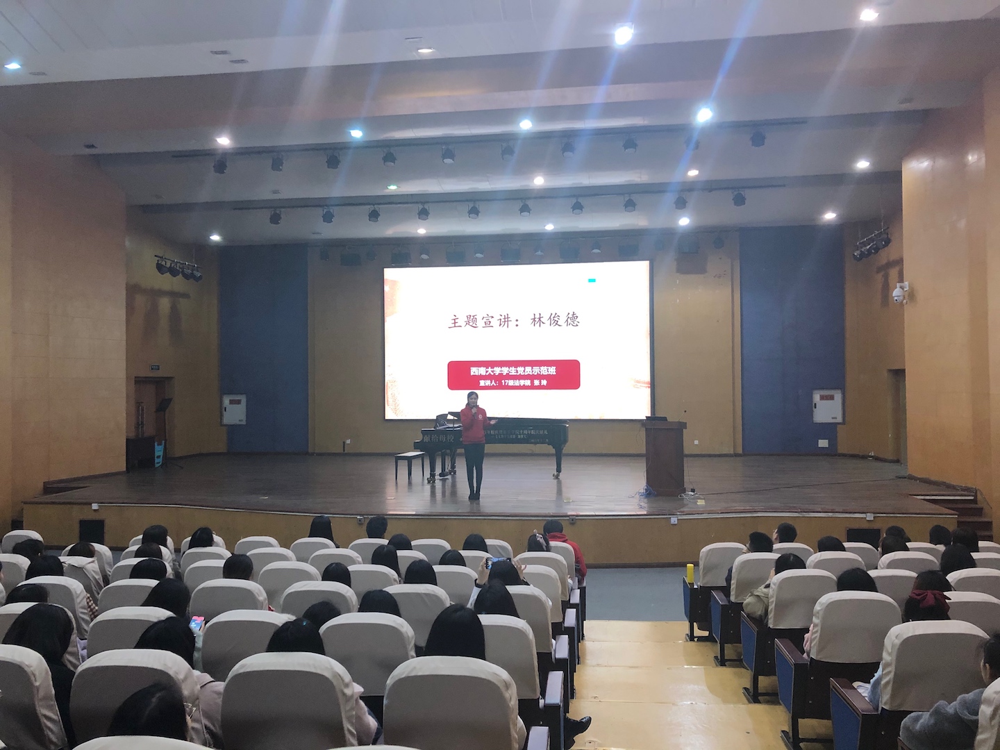 近日,按照学校“不忘初心、牢记使命”主题教育部署,由学校学生党员示范班、大学生中国特色社会主义理论体系宣讲团的学生党员组成的宣讲队深入学校各二级党组织,开展了“奋斗的我,最美的国”主题宣讲活动,为上千名党员师生现场分享优秀党员先进事迹,激励大家坚守初心,勇担使命。
