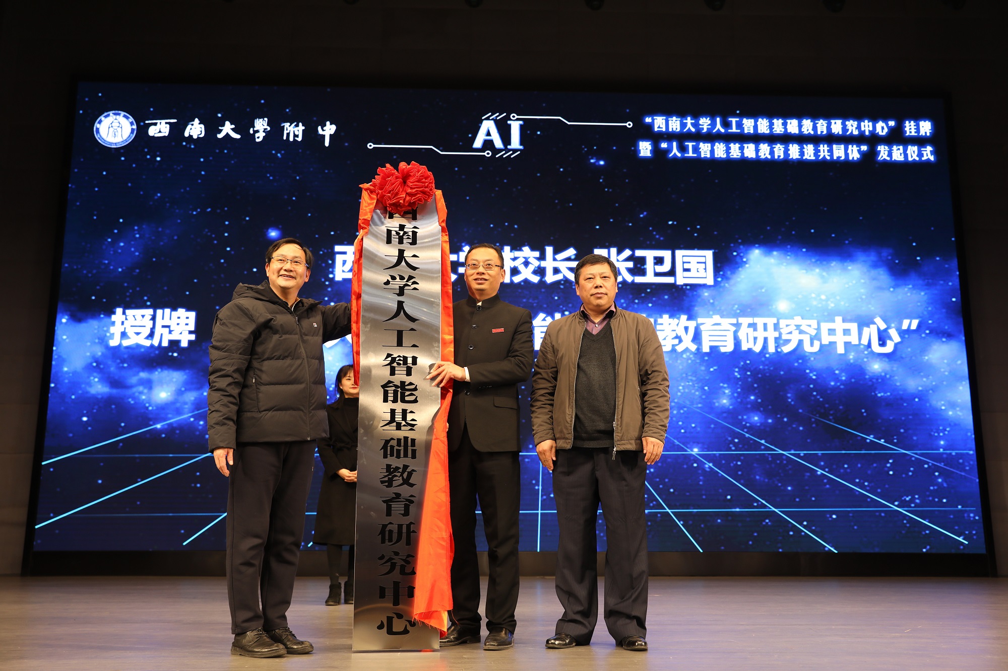 张卫国校长向人工智能学院副院长段书凯、附属中学校长欧健授牌“beat365英国官网人工智能基础教育研究中心”。