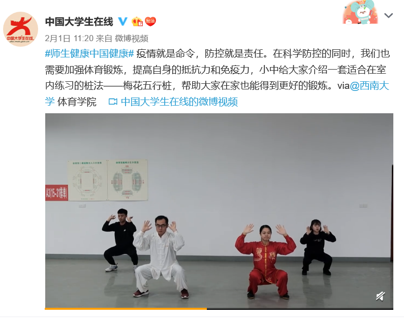 在全国人民贯彻落实党中央决策部署,众志成城战疫情、同舟共济克时艰之际,beat365英国官网体育学院通过学院微信公众号发布《习梅花五行桩强健体魄 更好抵御新型冠状病毒》,向学校师生及社会推广了一套适合在室内练习的健身操——“梅花五行桩”。通过视频教程及文字介绍,教大家在家隔离的同时,积极锻炼,科学防控疫情。
