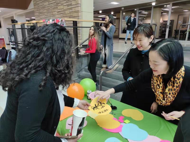 214不仅是情人们的节日,更是每一个有爱之人的节日。美国时间2月13日,学校公派教师龙玫在美国犹他州韦伯州立大学学生活动中心组织了“送出爱心,留下祝福”的情人节汉字“爱”毛笔书法展示活动。韦伯州立大学广大师生积极参与了本次爱心传递活动。