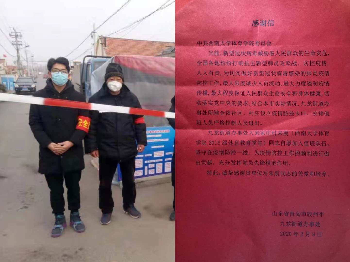 体育学院党委近日收到一封来自胶州市九龙街道办事处的感谢信,对学院2016级体育教育专业学生党员宋震同志充分发挥党员先锋模范作用,主动参与社区疫情防控工作表示肯定,并感谢学院党委对他的培养。据了解,宋震同志在疫情爆发后主动向村支书请缨加入疫情防疫一线工作,在防控卡口对本村人员进行登记、消毒,宣传防护知识,并制作村里的视频宣传片。