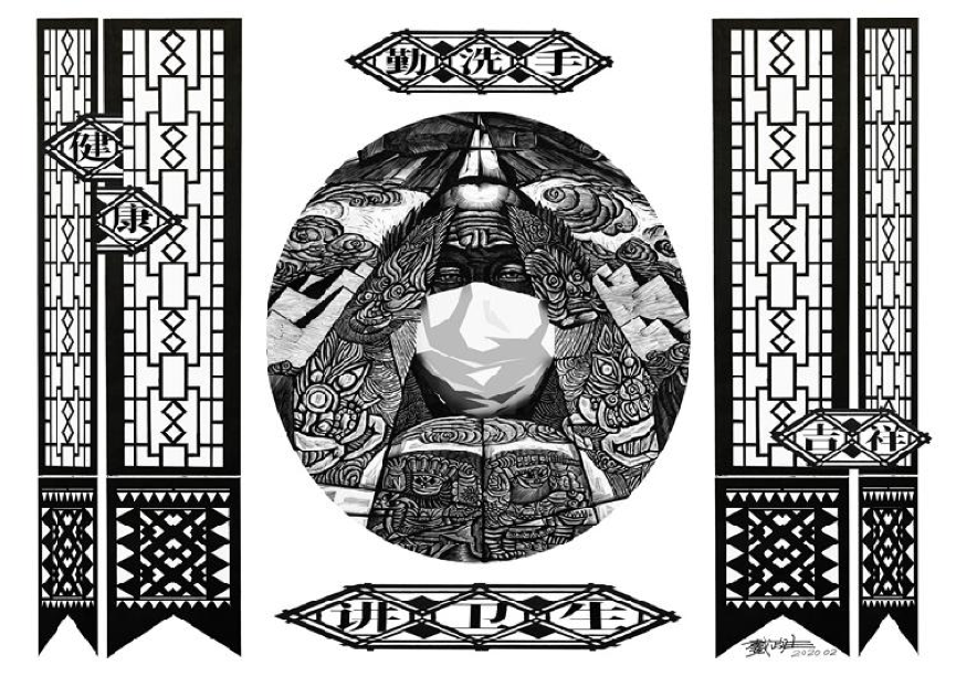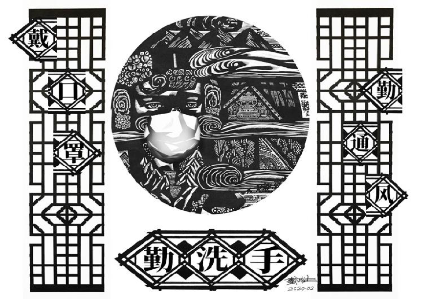 记者在戴政生创作的“2020新农村抗击疫情”系列木刻版画作品中看到,作品中有窗花图案,有戴着口罩的人物或门神,人物周围点缀有牡丹花、挑花刺绣、剪纸、年画等纹饰,还有信科学、不传谣、戴口罩、勤洗手等文字。传统的纹饰和现代的口罩形成鲜明的对比,趣味性和美感油然而生。