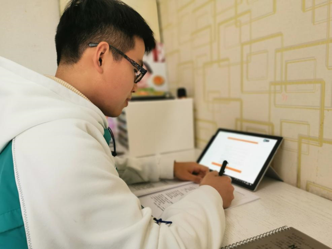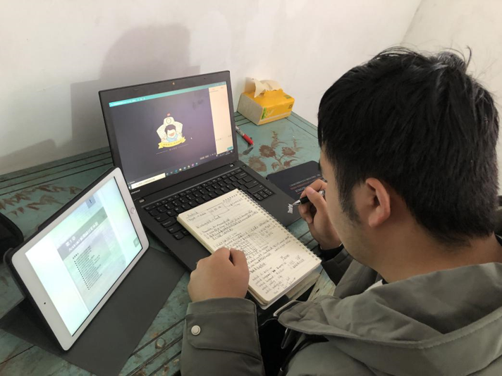 在河南信阳,彭国栋比往常早半个小时吃完晚餐坐在了书桌前。桌前一人一笔一本,还有笔记本电脑、平板电脑、手机,屏幕的荧光映照着正用功预习着“移动应用开发进阶”课程的他。“父母对我上课这件事非常上心,早早的就把后勤保障做好了。”结束了一天的课程后,彭国栋感叹到,“学校能如期开课太棒了,规律的学习和生活让人非常充实!”当老师问到线上课程的效果怎么样,能不能适应时,彭国栋说,“请老师放心,即使在家,对学习的热情也不会变,我会和学校一起并肩抗疫。