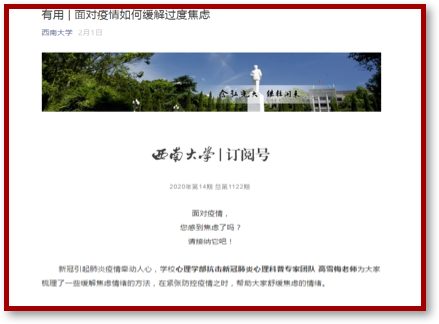 开展一次心理科普。1月30日上午,心理学部党委成立抗击新冠肺炎心理科普专家团队,高雪梅书记积极参与团队的策划、组织,与党员同志郭成、刘衍玲等同志一起参与到撰写工作中。20天来,与学部其他专家一起,撰写推送五个系列近20篇科普文章,阅读量5万多。科普团队的工作得到了众多媒体的报道,推文陆续被重庆教育等众多平台转发。2月16日,由高雪梅任副主编、郭成等党员同志参编的《疫情中的心理关爱手册》电子版上网发行,手册通俗易懂、图文并茂、简单实用,对普通民众、儿童、学生、隔离人员、确诊患者和医护人员等疏解疫情中的心理困扰和压力有很强的针对性。
