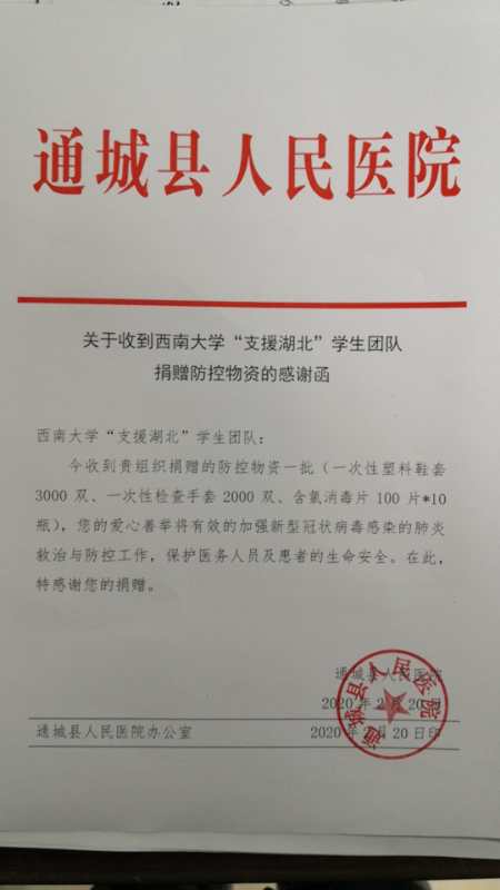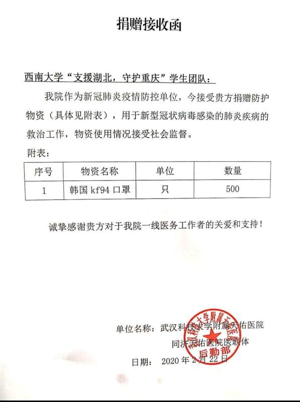 为抗击疫情,数名政管学子通过组织捐款、志愿服务等方式积极行动,贡献力量。2017级本科生曾诗雅同学作为发起人联合生科院、心理学部、文学院、体育学院等4名学生发起了“支援湖北,守护重庆”公益援助活动,通过朋友圈筹集爱心善款24328.44元,为武汉科技大学附属天佑医院等4所湖北省内医院提供5650只口罩、3000双塑料鞋套、2000双橡胶检查手套、1000片含氯消毒片等医用物资。曾诗雅表示,“作为当代青年,就应该心中有家国,行动是最好的爱国!”