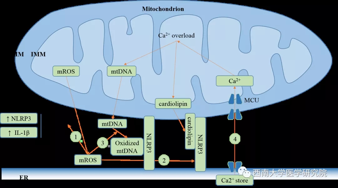 内质网是一个大的、动态的内膜腔,与其他细胞器,如线粒体和溶酶体,在结构和功能上紧密联系,调控细胞信号转导。内质网参与蛋白质折叠、运输和脂质合成,当内质网内错误折叠的蛋白超过内质网的处理能力时,称为内质网应激。在机体受到损伤和感染时NLRP3炎性小体激活,内质网应激在此过程中发挥重要作用。脂质紊乱、胆固醇迁移到内质网和识别内质网应激的传感器IRE1α和PERK通过调控NLRP3的亚细胞定位和钙离子迁移激活NLRP3炎性小体。