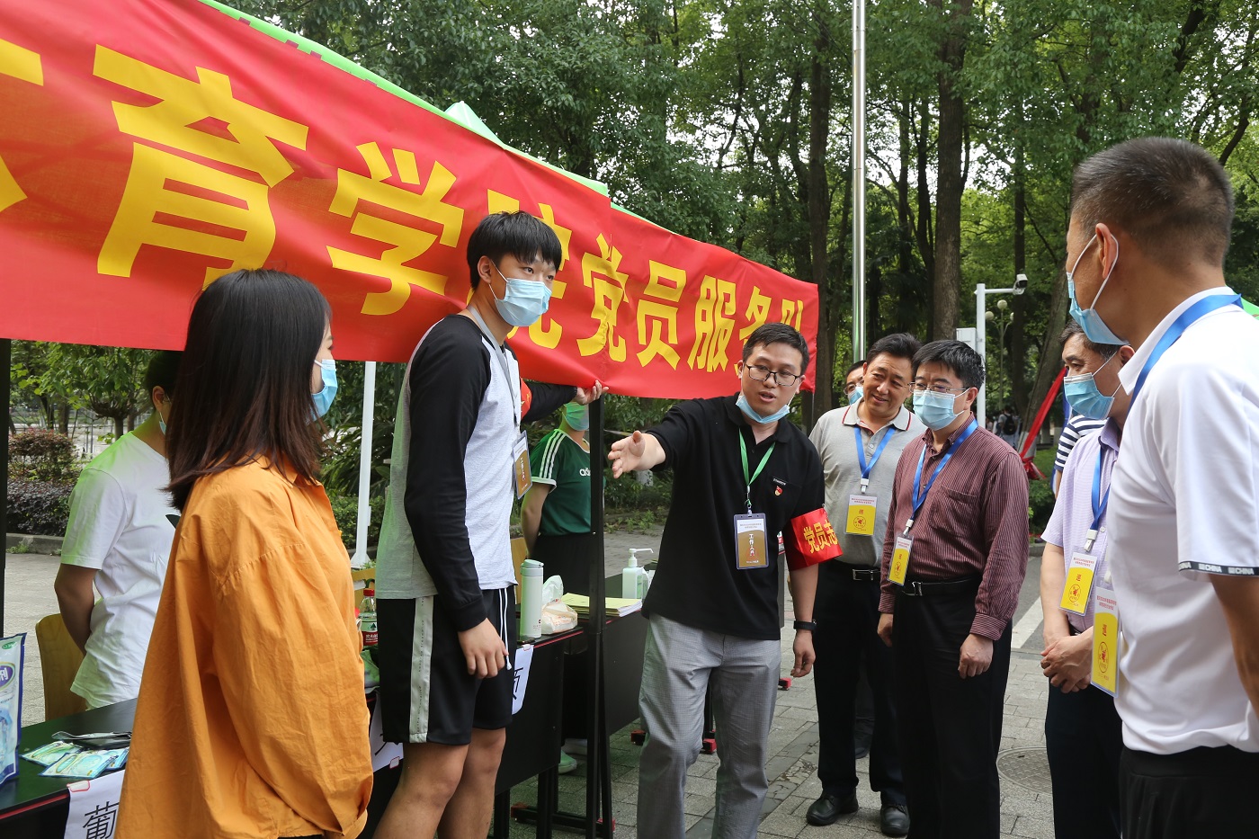 在中心体育馆入口,李旭锋与体育学院党员服务队队员亲切交谈,了解为考生准备的医药服务用品情况,体育学院汇报了党员服务队工作情况,介绍了在疫情防控期间党员志愿服务先进事迹。李旭锋对党员服务队表示肯定,希望以此为契机提升党建工作质量,巩固巡察整改成果,加强党员教育管理。