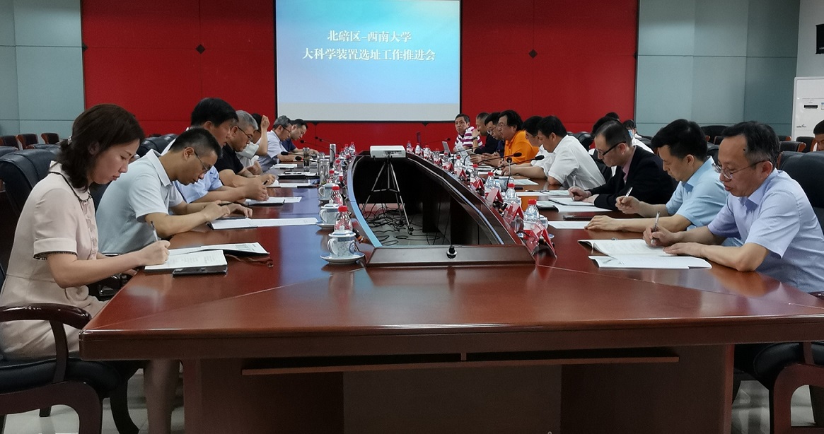 6月22日下午,北碚区人民政府在区行政中心三楼会议室组织召开北碚区-beat365英国官网关于大科学装置选址工作推进会。北碚区区委书记周旭、区长何庆、常务副区长董伦,歇马高新区指挥长胡湧,学校党委书记李旭锋,校长张卫国,副校长崔延强、温涛、赵国华,以及学校党政办公室、发展规划与学科建设部、科学技术处、国内合作处、生物学研究中心相关部门负责人参加会议。会议由何庆主持。
