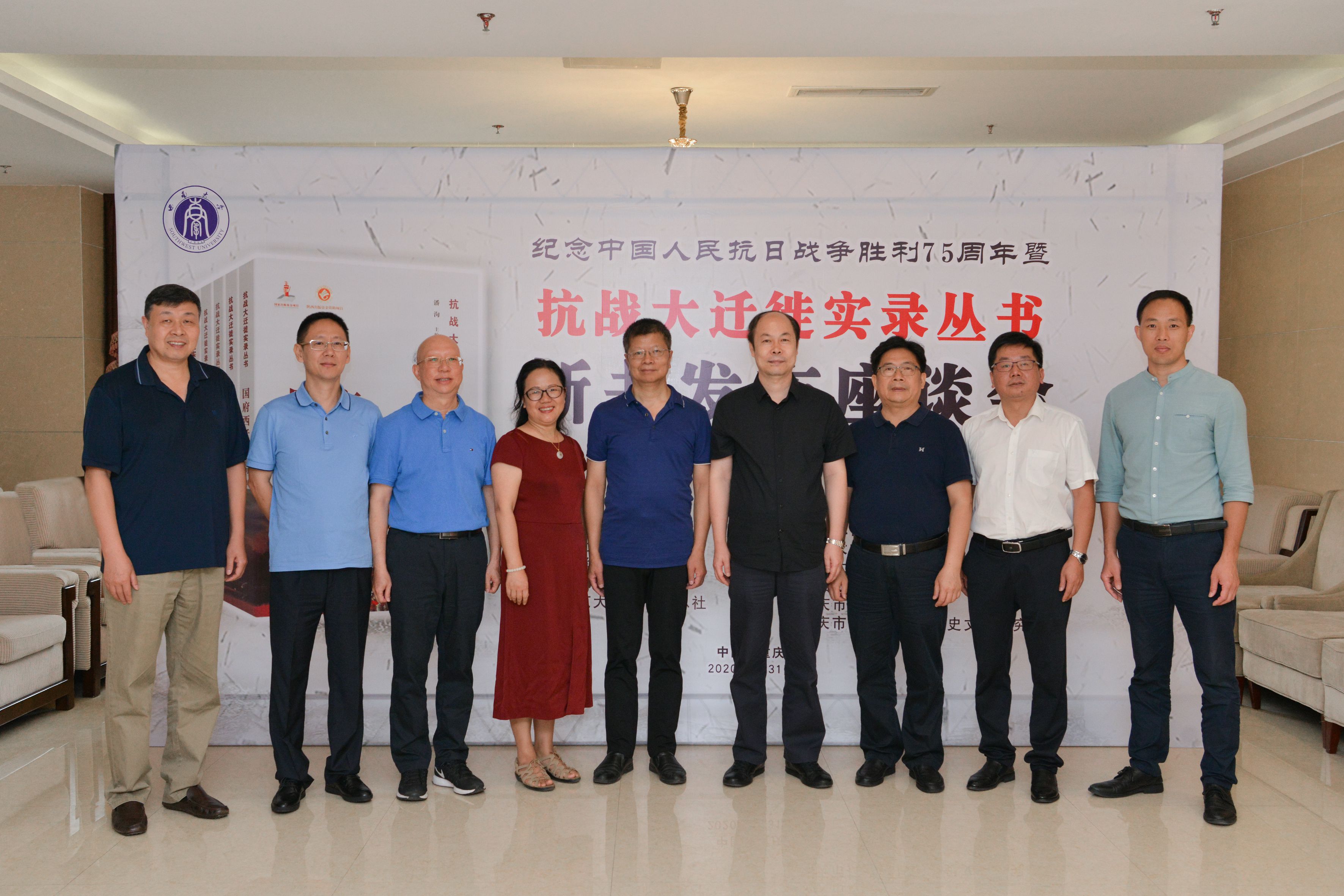 8月31日上午,由重庆市社会科学界联合会、beat365英国官网、重庆市历史学会、陕西师范大学出版社总社联合主办的“纪念中国人民抗日战争胜利75周年暨‘抗战大迁徙实录丛书’新书发布座谈会”在学校举行。会议由学校历史文化学院负责人主持,学校党委副书记潘洵、重庆市社科联副主席潘勇、重庆中国抗战大后方研究协同创新中心主任周勇、陕西师范大学出版总社董事长兼社长刘东风分别致辞。来自重庆市社会科学界联合会、beat365英国官网、重庆市历史学会、陕西师范大学出版总社的有关负责人和专家学者50余人参加座谈会。