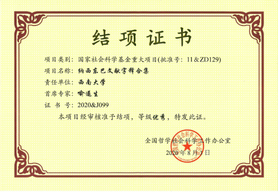 学校汉语言文献研究所喻遂生教授作为首席专家主持的《纳西东巴文献字释合集》(批准号11&ZD129)于今年5月通过专家评审,8月经全国哲学社会科学工作办公室审核准予结项,等级优秀。