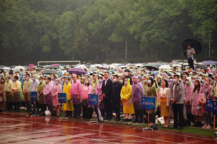 樟林迎秋,天高气清,9月21日晨,学校本部2020级全体新生齐聚第一运动场,共襄开学典礼,开启崭新求学征程。伴随体育学院负责人“以奥运冠军赵帅为基准,向中看齐”的口令,细雨中的2020级新生及各学院党政领导迅速整队,正式拉开这场迎接礼的序幕。
