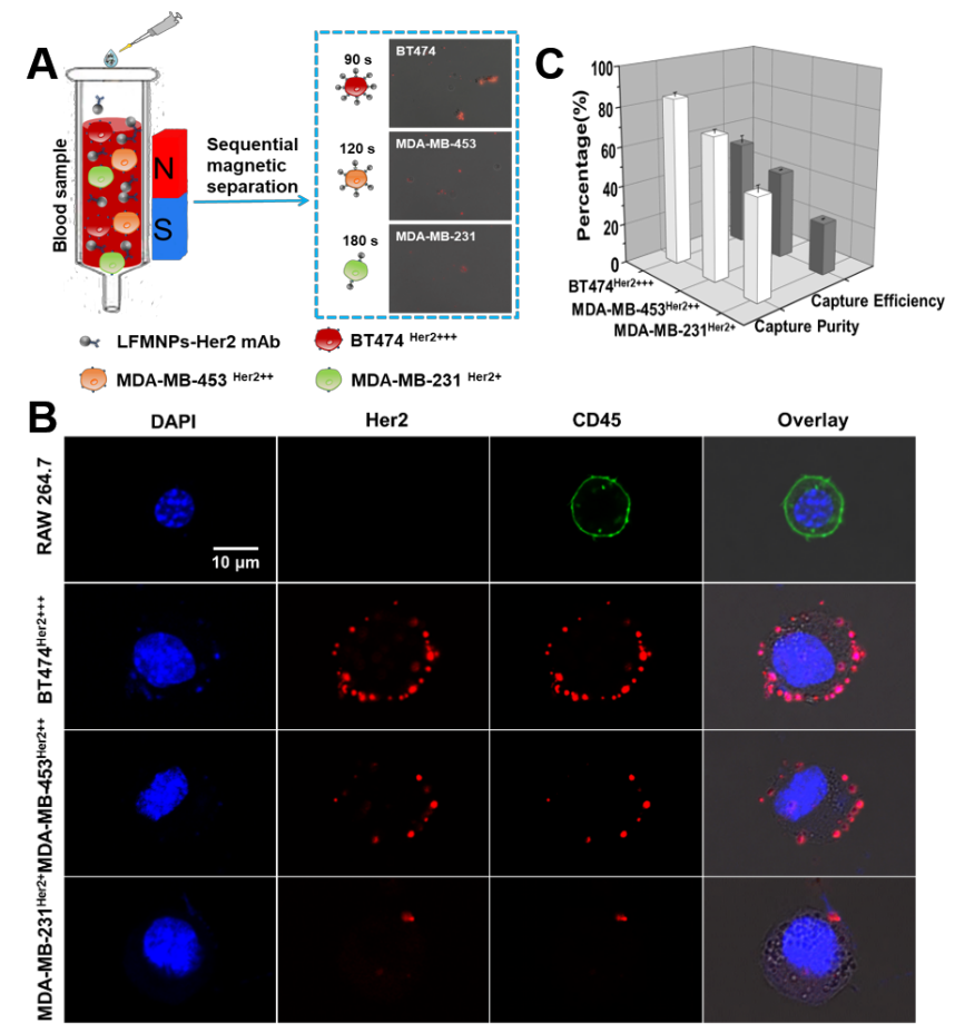 肿瘤细胞异质性是肿瘤异质性的重要成因之一,可导致肿瘤在增殖能力、侵袭能力和药物敏感性等方面产生重要差异,影响肿瘤的诊断与治疗,最终影响患者身体健康与生命安全。因此,肿瘤细胞异质性研究对于肿瘤的诊断和个体化治疗具有重要意义。而进行肿瘤细胞亚群分离分析是研究肿瘤细胞异质性的重要基础。现有的基于电泳、场流或荧光激活式分离原理的进行肿瘤细胞分离分析的策略存在着特异性差、操作繁琐或需样本量大等弊端。基于课题组在磁性梯度分离细菌、肿瘤标志物、蛋白分析等方面前期工作(Analytical Chemistry2018, 90, 9621-9628;Analytical Chemistry2014,86, 9434-9442;Chemistry-A European Journal2014, 20,14642-14649),该研究以细胞表面标志物Her2表达量差异化的三种乳腺癌细胞(BT474、MDA-MB-453和MDA-MB-231)为研究模型,通过荧光-磁性靶向仿生探针与其识别后形成不同磁性梯度,在恒定外磁场作用下,可分别在90 s、120 s和180 s时间内快速逐一梯度分离出三种不同乳腺癌细胞亚型,并基于探针的荧光信号对肿瘤细胞亚群进行了初步鉴定。该研究报道的基于磁性梯度响应的肿瘤细胞亚群分离分析策略具有简单、快速、准确等特点,为血液样本中异质性肿瘤细胞亚群的近同时分离与分析提供新思路,在肿瘤早期诊断、评估和预后方面具有重要的潜在应用前景。
