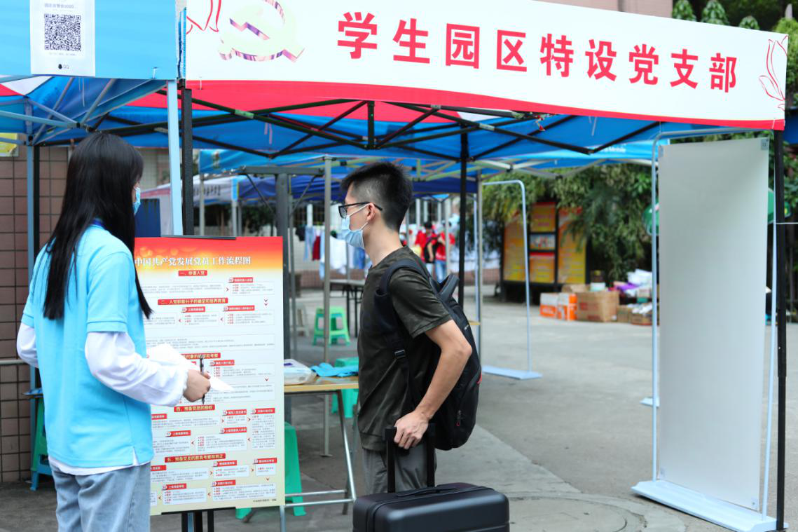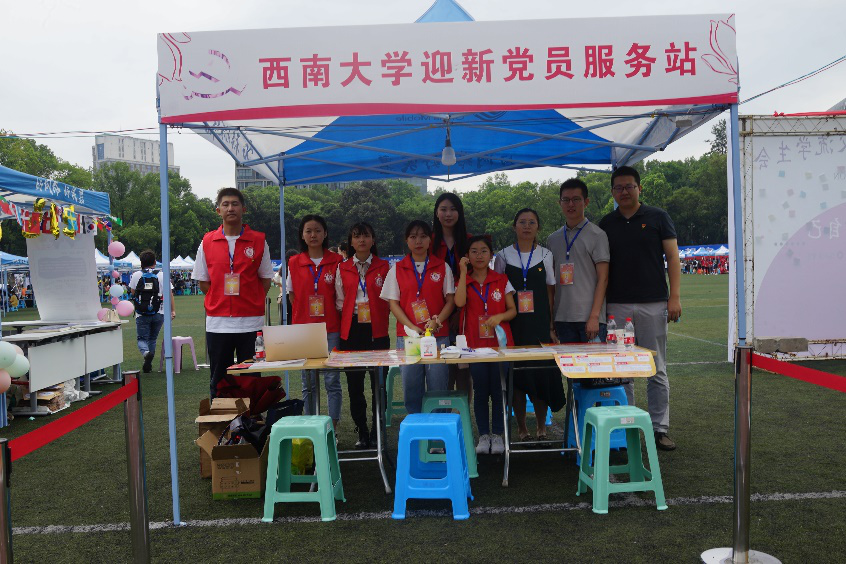 党委组织部在迎新现场设立“迎新党员服务站”,各学院(部)在迎新点设立“党员先锋岗”或“党员示范岗”,组织党员志愿服务队,统一着装,佩戴党员徽章,为新生提供热情周到的服务。教师党员为新生解答各种报到问题、搬运行李、宣传党的政策方针、介绍入党流程等。动物科学技术学院负责人与学院党员志愿者一起,亮身份树形象,共同迎接新生;体育学院负责人带领学生党员走访新生寝室,普及党的知识,讲解入党程序,向有入党意愿的新同学送党章。