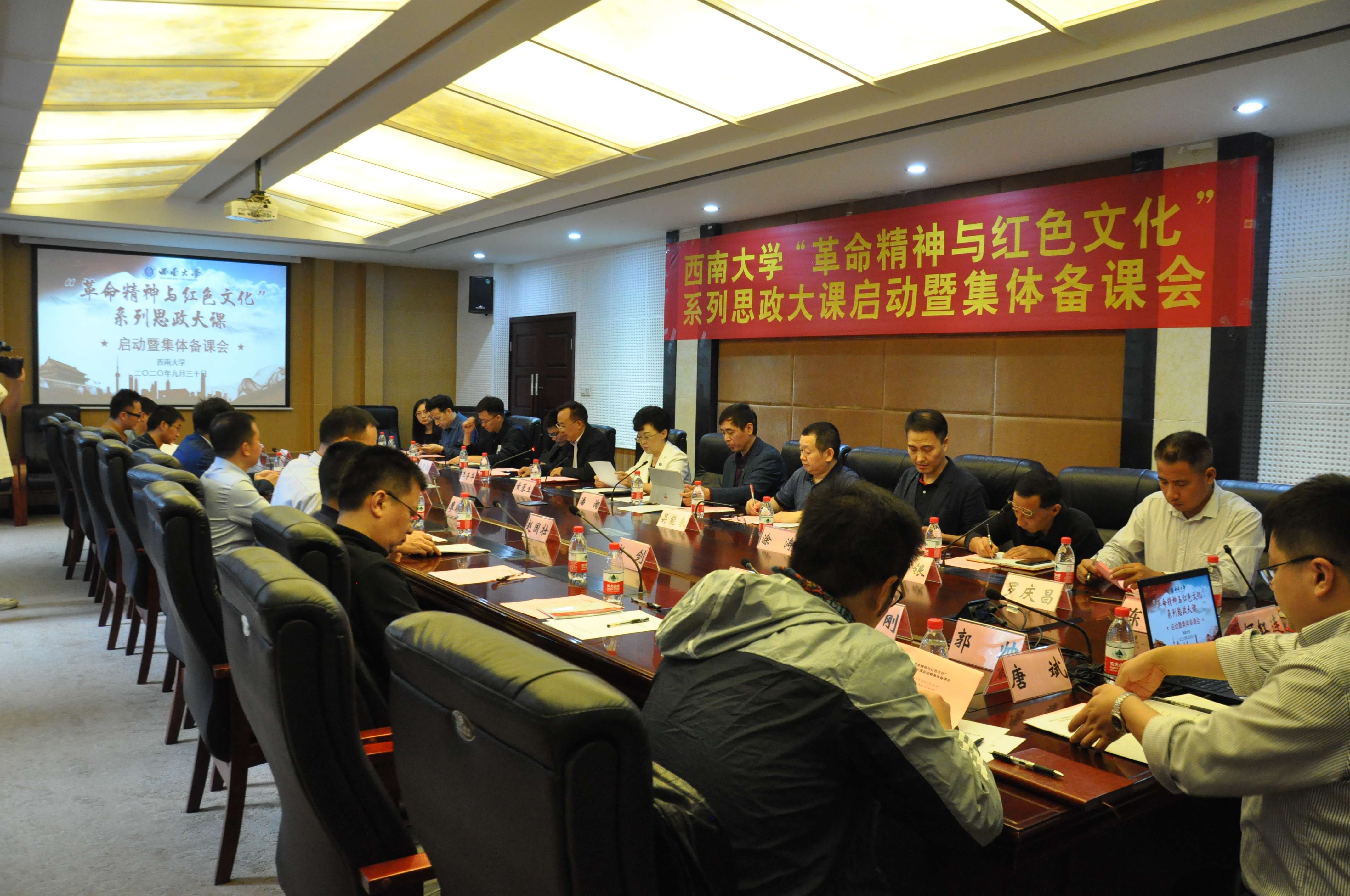 9月30日,学校“革命精神与红色文化”系列思政大课启动暨集体备课会在马克思主义学院举行。学校党委副书记潘洵,党委常委、党委宣传部部长、党委网络工作部部长李荣华以及教务处、研究生院、党委学生工作部、校团委等职能部门,文学院、历史文化学院民族学院、音乐学院、美术学院、新闻传媒学院及10门获准立项课程的负责人参加会议。马克思主义学院黄蓉生教授莅临指导。