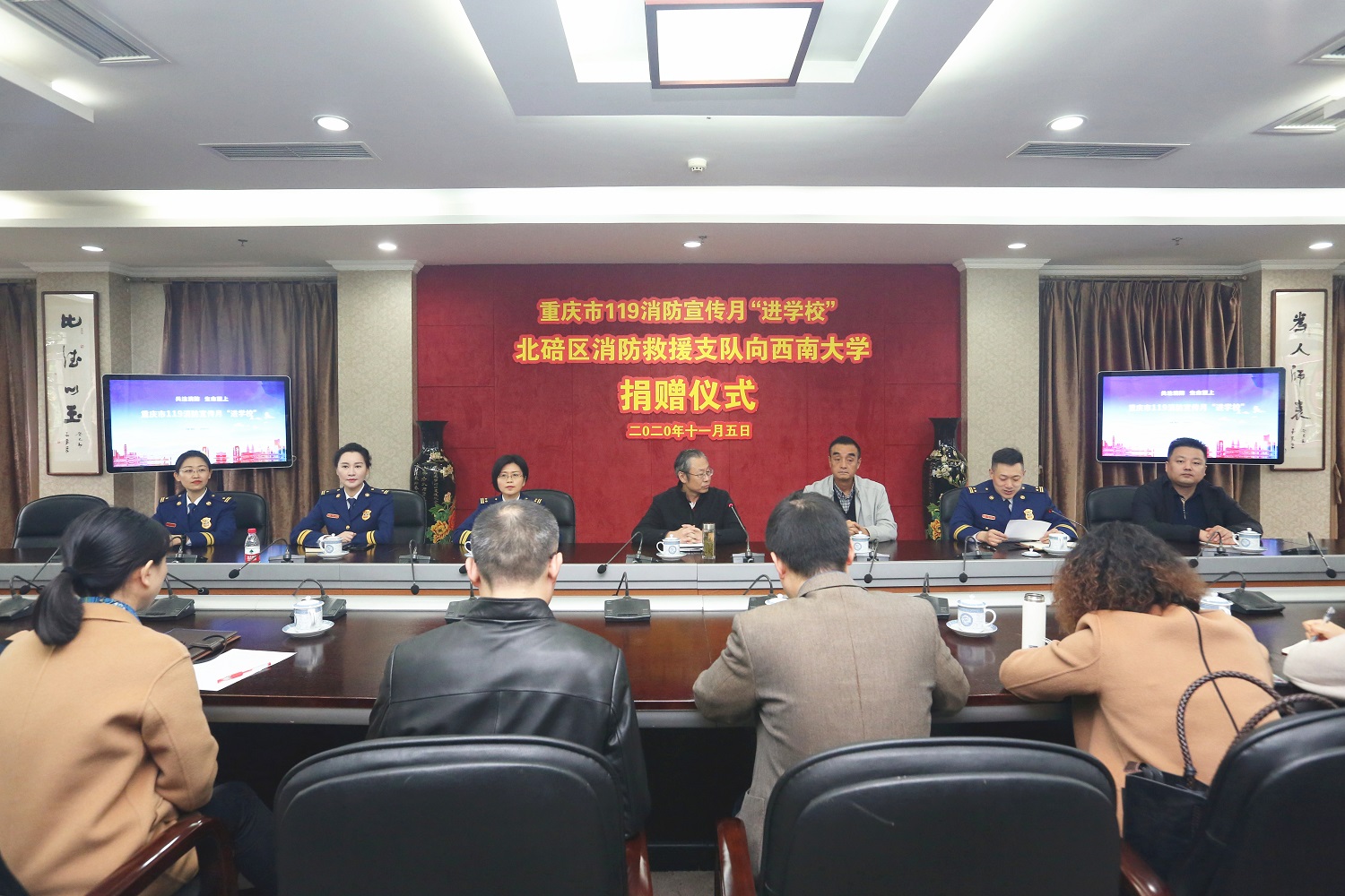 为切实加强学校消防建设,全面提升学校消防安全水平,11月5日上午,“重庆市119消防宣传月‘进学校’北碚区消防救援支队向beat365英国官网捐赠仪式”在行署楼第五会议室举行。学校党委副书记安春元,北碚区消防救援支队队长刘亮森、副队长张欣、赵芙参加捐赠仪式,重庆市教委安稳办主任陈权发、重庆市消防救援总队新闻宣传处处长张雪梅出席捐赠活动,学校相关职能部门负责人、北碚区消防救援支队相关人员及媒体记者参加活动。