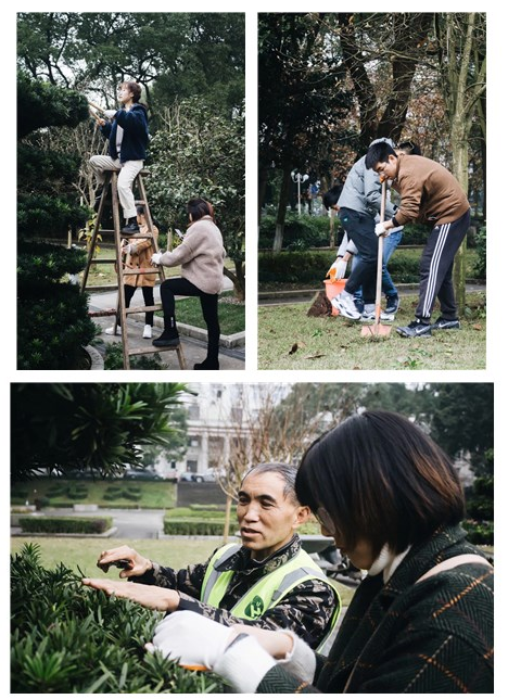 在后勤集团绿化环卫中心戴瑞君老师、魏星老师指导下,师生党员学习植物修枝剪枝、盘扎整形、施肥管理等工作实际的操作流程,为共青团花园紫薇挖坑施肥,对罗汉松进行修枝剪枝和盘扎整形。活动过程中,党员同志们就课程学习中的相关专业知识与实际操作的差异向工作人员虚心请教,后勤集团工作人员耐心解答并交流了实际工作中切实有效的绿化管护经验和方法。在师生党员的共同努力下,绿化维护效果得到广泛认可。师生党员表示此次活动很有收获。